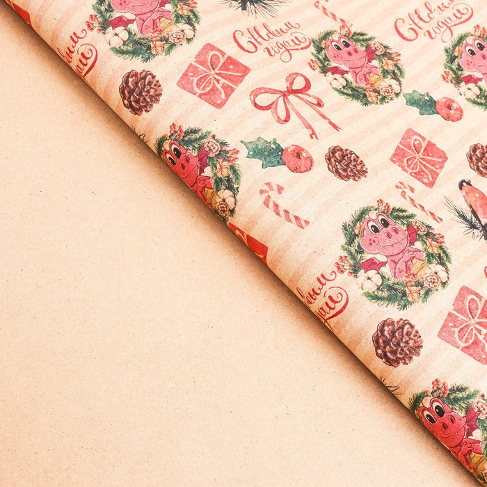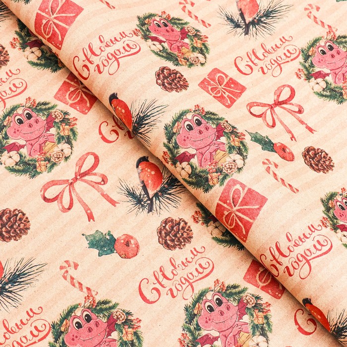 Бумага упаковочная крафт бурый « Дракоша в венках», 70×100 см,1 лист