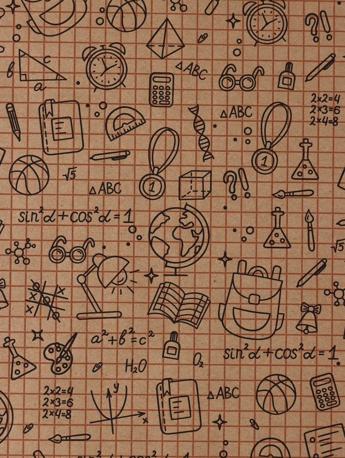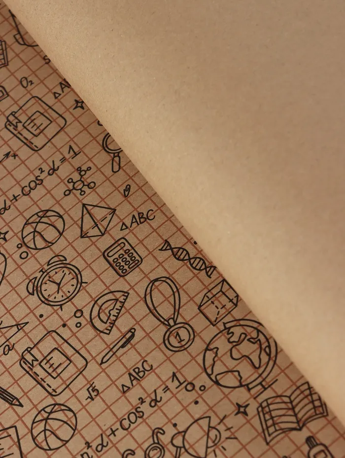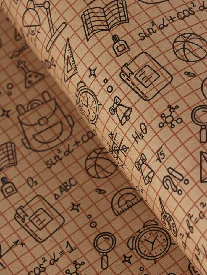 - Яркий школьный дизайн: На бежевом фоне крафтовой бумаги выделяются контрастные черные и коричневые узоры — цифры, буквы и символы школы. Такой рисунок создает праздничное настроение и точно передает тематику события.