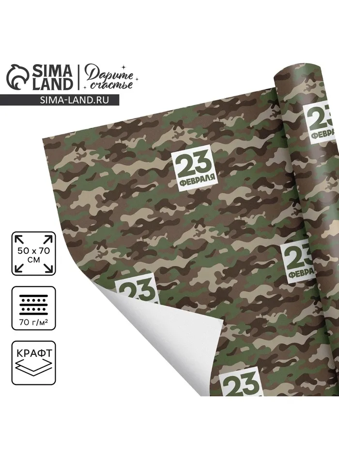 Бумага упаковочная крафтовая белая «23 февраля хаки», 50 x 70 см — Характеристики