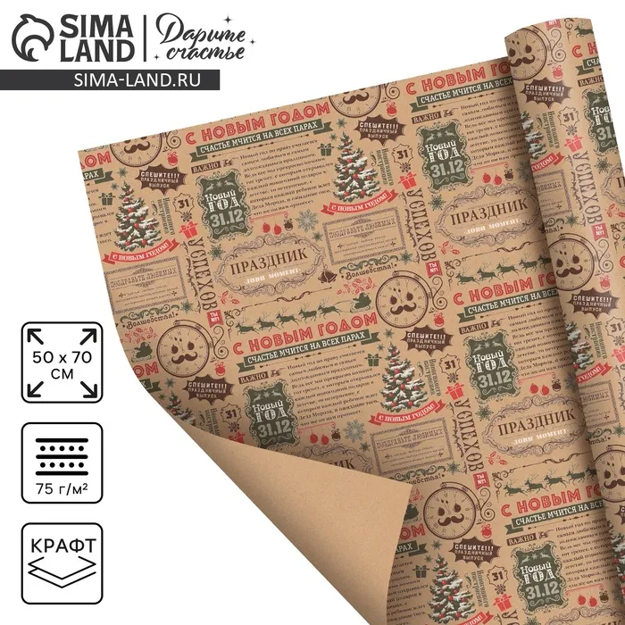 Бумага упаковочная крафтовая «Новогодняя газета», 50 х 70 см — Характеристики