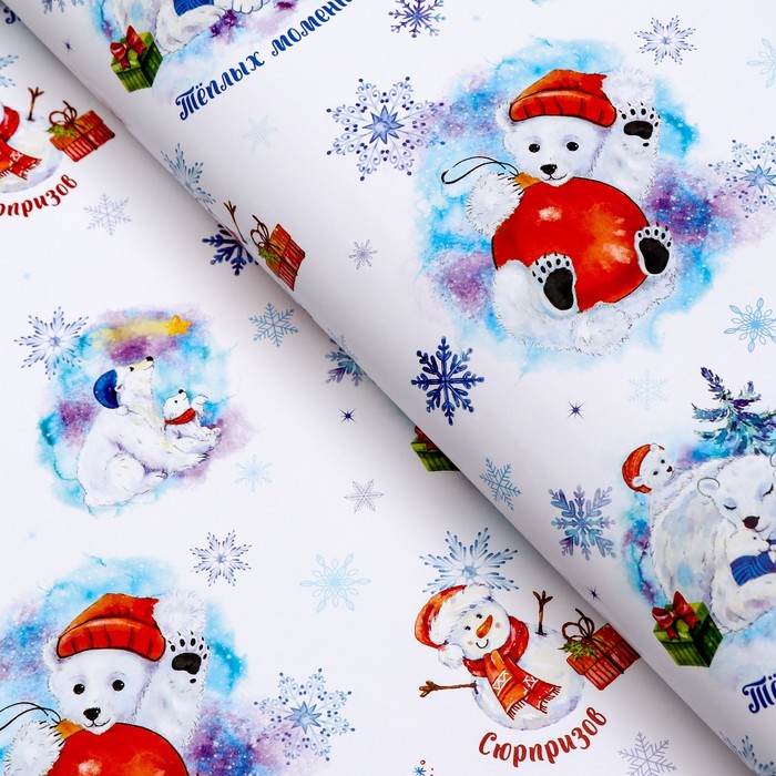 Бумага упаковочная новогодняя глянцевая "Белые медведи", 70 х 100 см.
