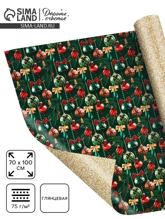 Бумага упаковочная новогодняя глянцевая двухсторонняя «Зелёная роскошь», 70 х 100 см — Характеристики