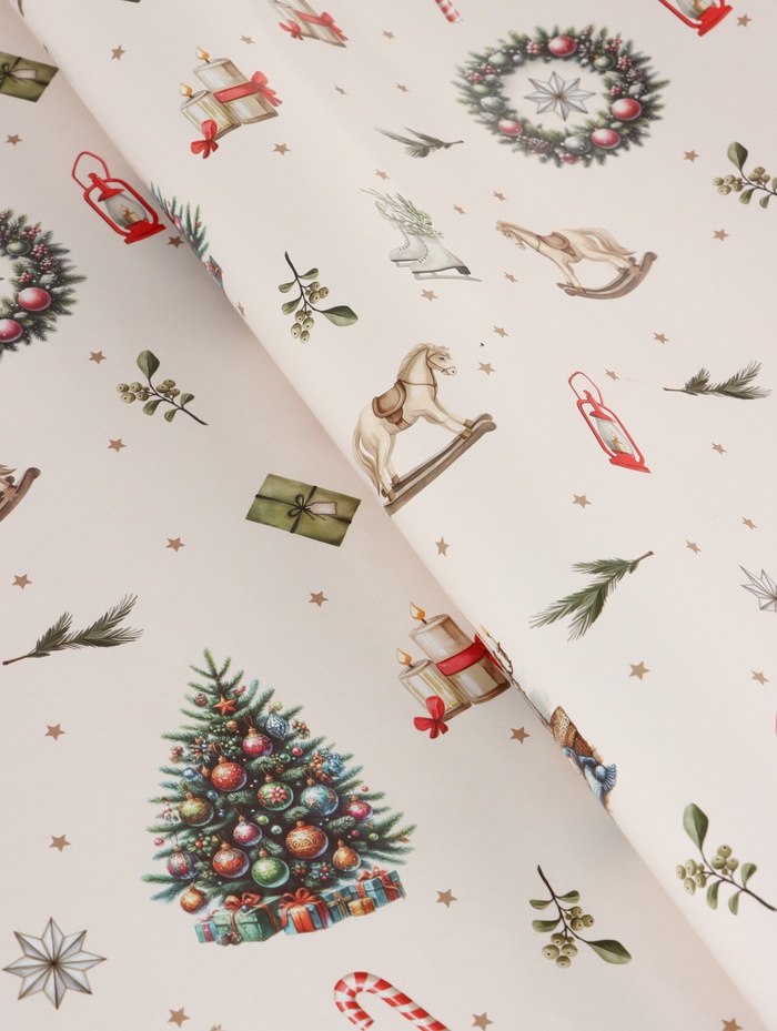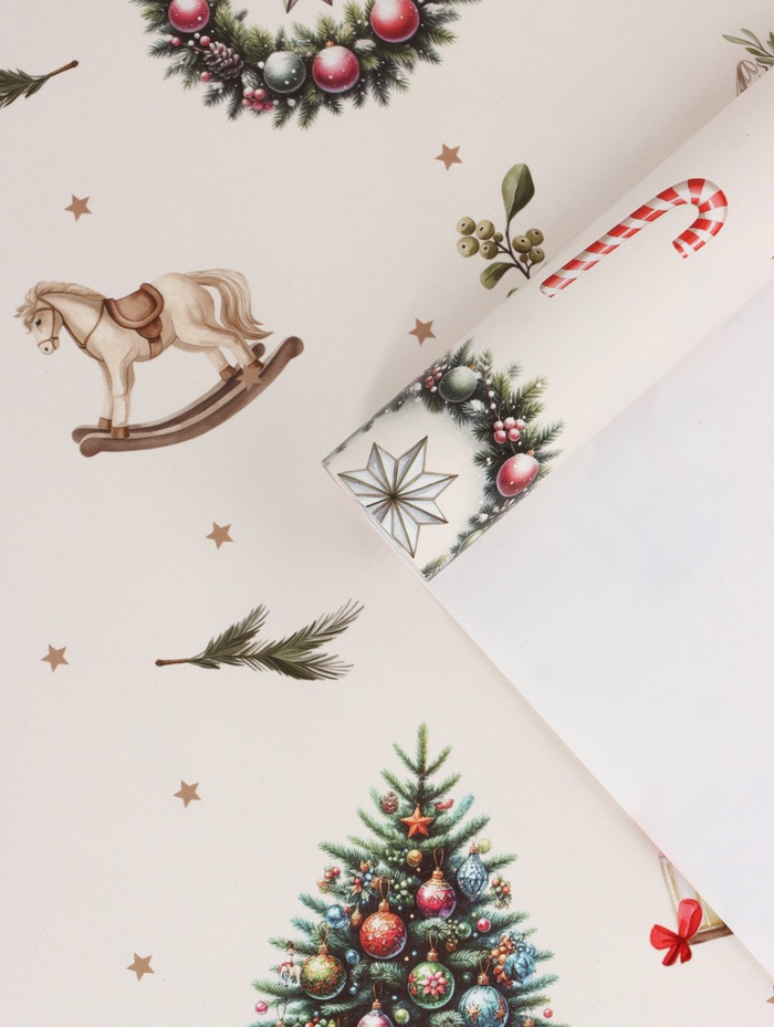 Для праздничных подарков: Бумага подходит для новогодних презентов любого размера — от маленьких сувениров до крупных коробок. Бежевый цвет сочетается с золотыми и красными лентами, создавая стильное оформление. Просто разверните лист, оберните подарок и закрепите декор — праздничный вид готов.