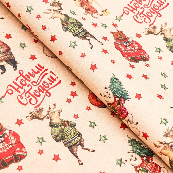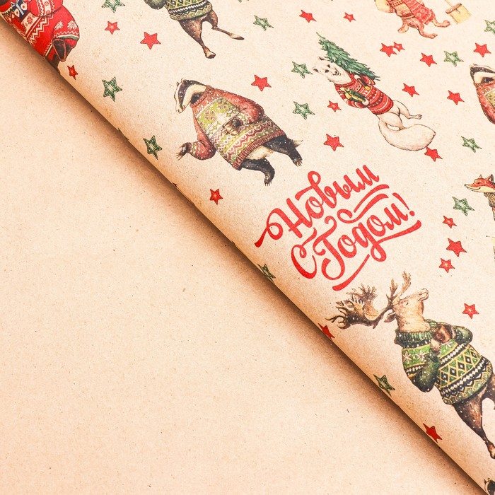 Бумага упаковочная новогодняя крафт бурый « Жители», 70×100 см