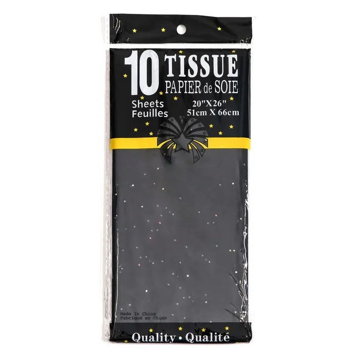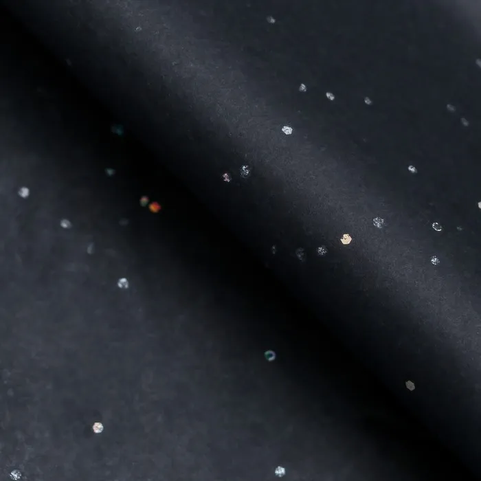 Элегантная загадочность для особых моментов! Чёрная бумага тишью с конфетти 50×66 см — стильное решение для создания изысканной упаковки. Глубокий чёрный цвет с контрастными крапинками придаёт подаркам особый шарм и таинственность.