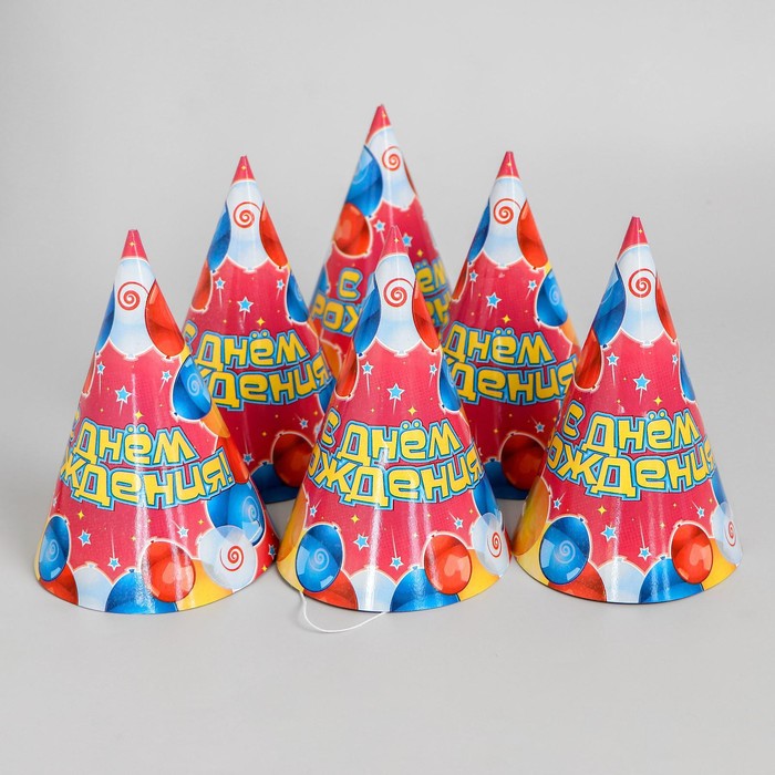 Бумажные колпаки «С днём рождения!», набор 6 шт., 16 см