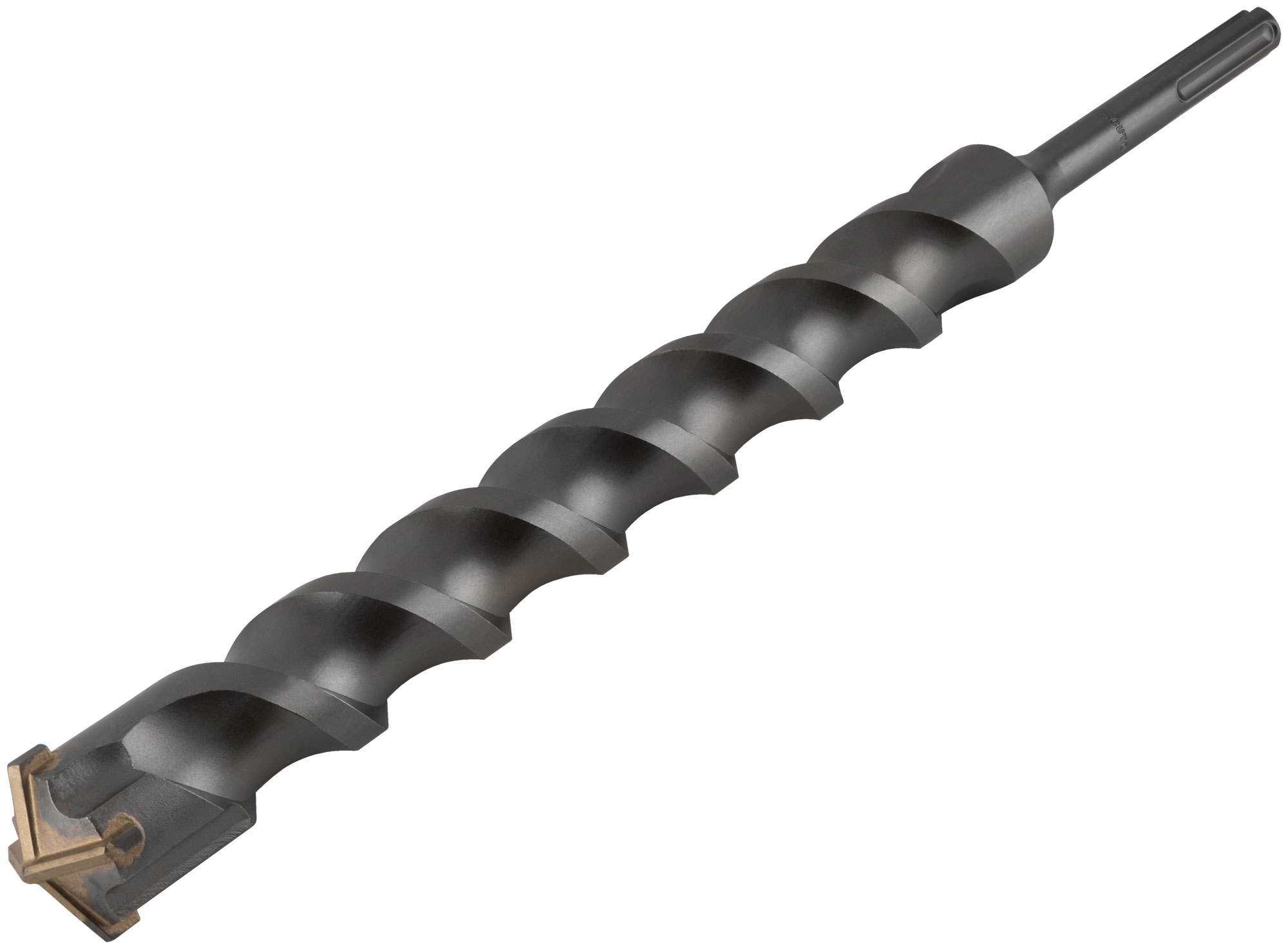 Бур оснащен хвостовиком SDS-Max, который обеспечивает надежную фиксацию в мощных перфораторах. Крестовой наконечник выполнен из сплава карбида вольфрама с добавлением 8% кобальта, что гарантирует долговечность и точность при сверлении. Спиральная часть из инструментальной стали проходит специальную термическую обработку, увеличивая стойкость к высоким нагрузкам.