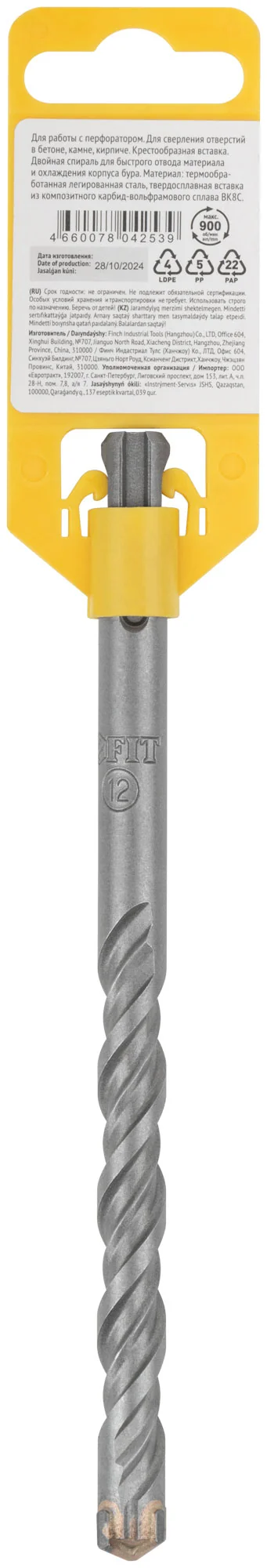 Легированная инструментальная сталь и твердосплавная вставка из карбида вольфрама ВК8С делают бур устойчивым к износу, что особенно важно при интенсивной эксплуатации. Упаковка в виде пластикового подвеса облегчает хранение и транспортировку.
