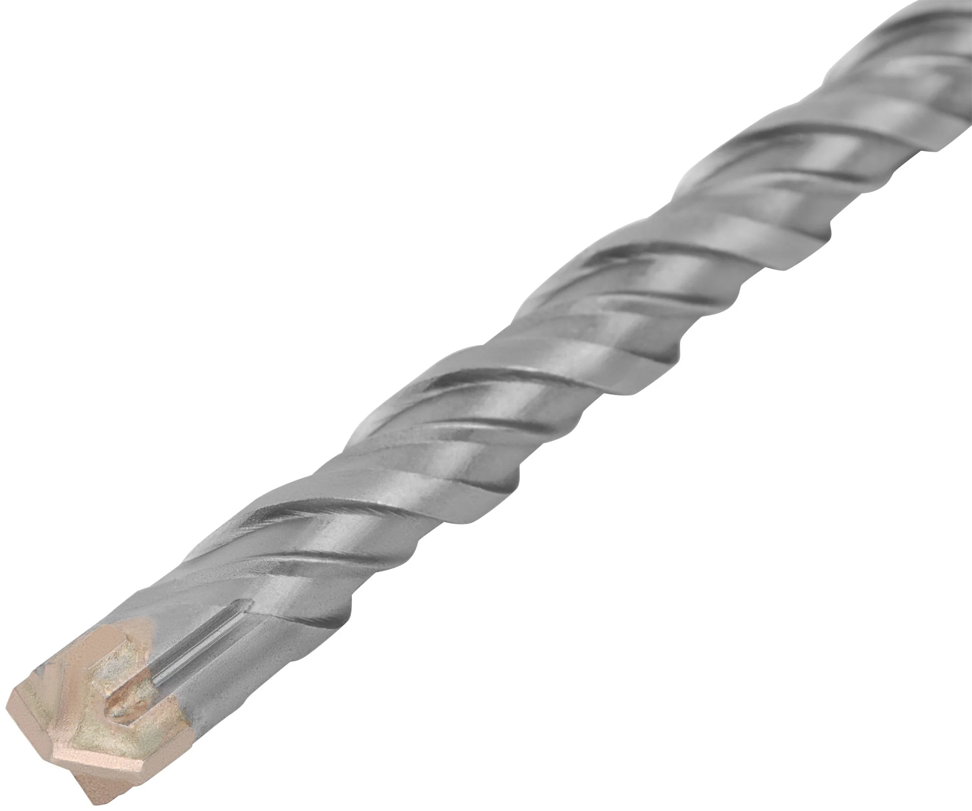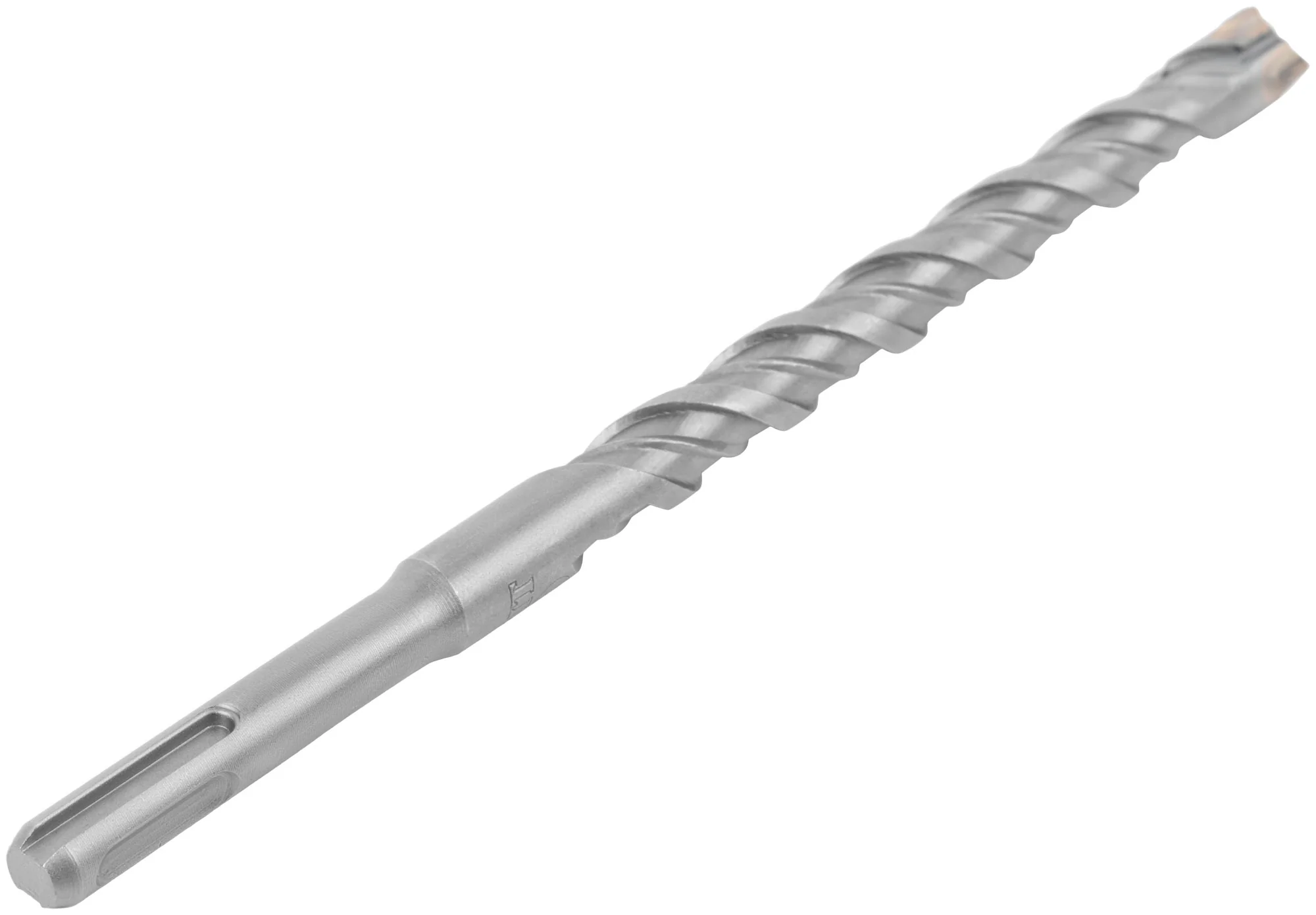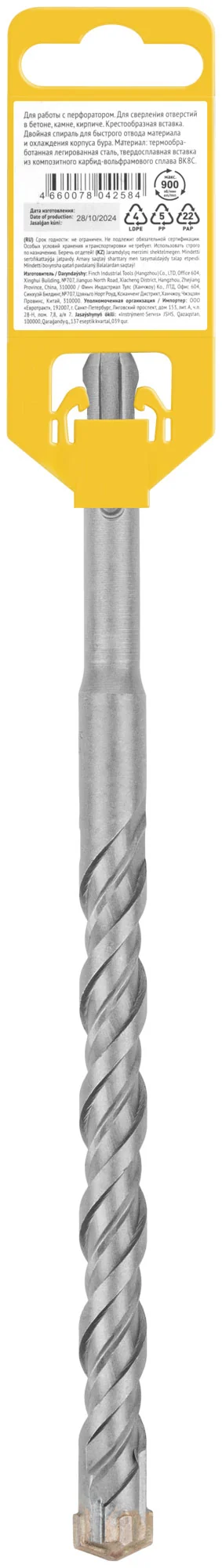 Конструкция бура включает SDS-PLUS хвостовик, который обеспечивает надежное крепление в перфораторе и минимизирует вибрации. Крестообразная вставка изготовлена с добавлением 8% кобальта, что значительно увеличивает производительность и долговечность. Двойная спираль способствует быстрому отводу материала и охлаждению корпуса, что предотвращает перегрев.