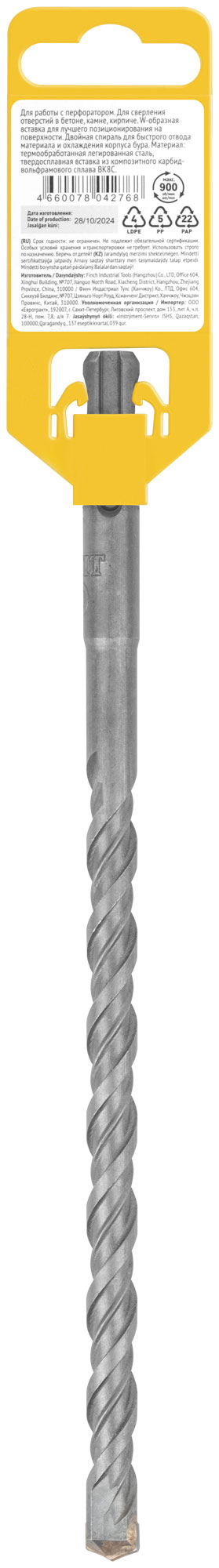 Бур имеет W-образную вставку с добавлением 8% кобальта, что улучшает позиционирование на поверхности. Двойная спираль способствует быстрому отводу материала и охлаждению корпуса бура, что значительно продлевает его срок службы. Изготовлен из легированной инструментальной стали и оснащён твердосплавной вставкой из карбида вольфрама ВК8С, что делает его идеальным выбором для профессионального использования.