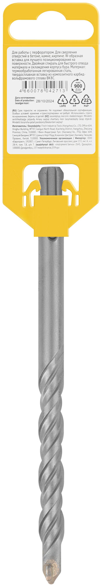Конструкция бура включает SDS-PLUS хвостовик и W-образную вставку с добавлением 8% кобальта, что обеспечивает лучшее позиционирование на рабочей поверхности. Двойная спираль позволяет быстро отводить материал и эффективно охлаждать корпус бура. Материал изготовления — легированная инструментальная сталь и твердосплавная вставка из карбида вольфрама ВК8С.