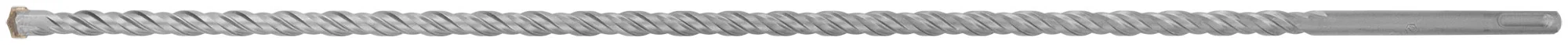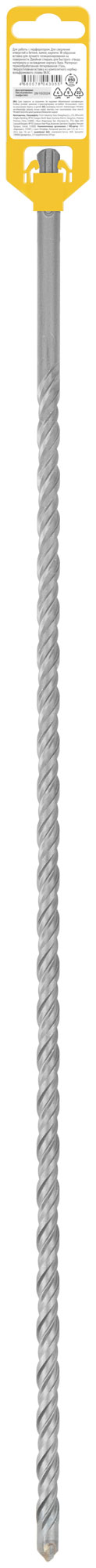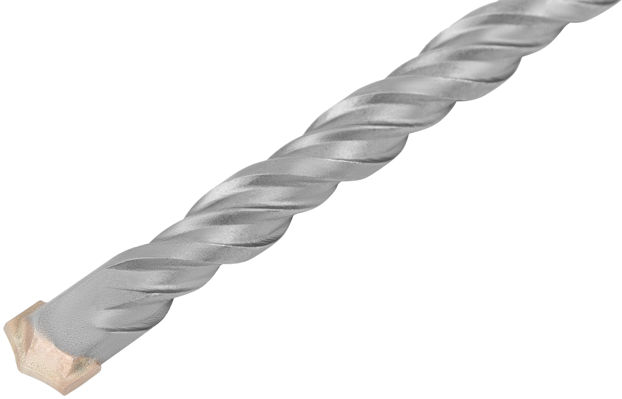 Бур оснащен SDS-PLUS хвостовиком, который надежно фиксируется в патроне перфоратора. W-образная вставка с добавлением 8% кобальта улучшает позиционирование на поверхности, а двойная спираль способствует быстрому отводу материала и охлаждению.