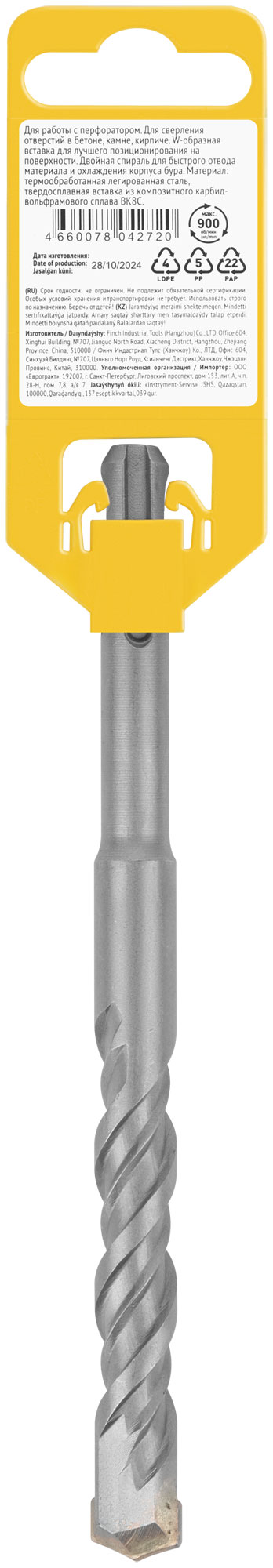 Конструкция бура включает SDS-PLUS хвостовик для надежного крепления и двойную спираль для эффективного отвода материала и охлаждения во время работы. Изготовлен из легированной инструментальной стали и твердосплавной вставки из карбида вольфрама ВК8С, что гарантирует долговечность и износостойкость.