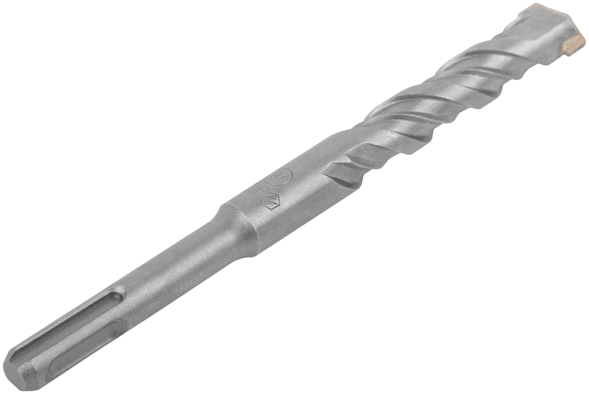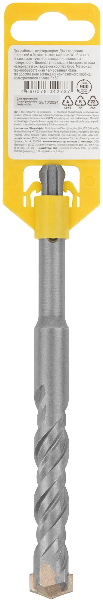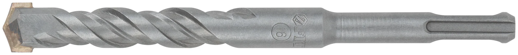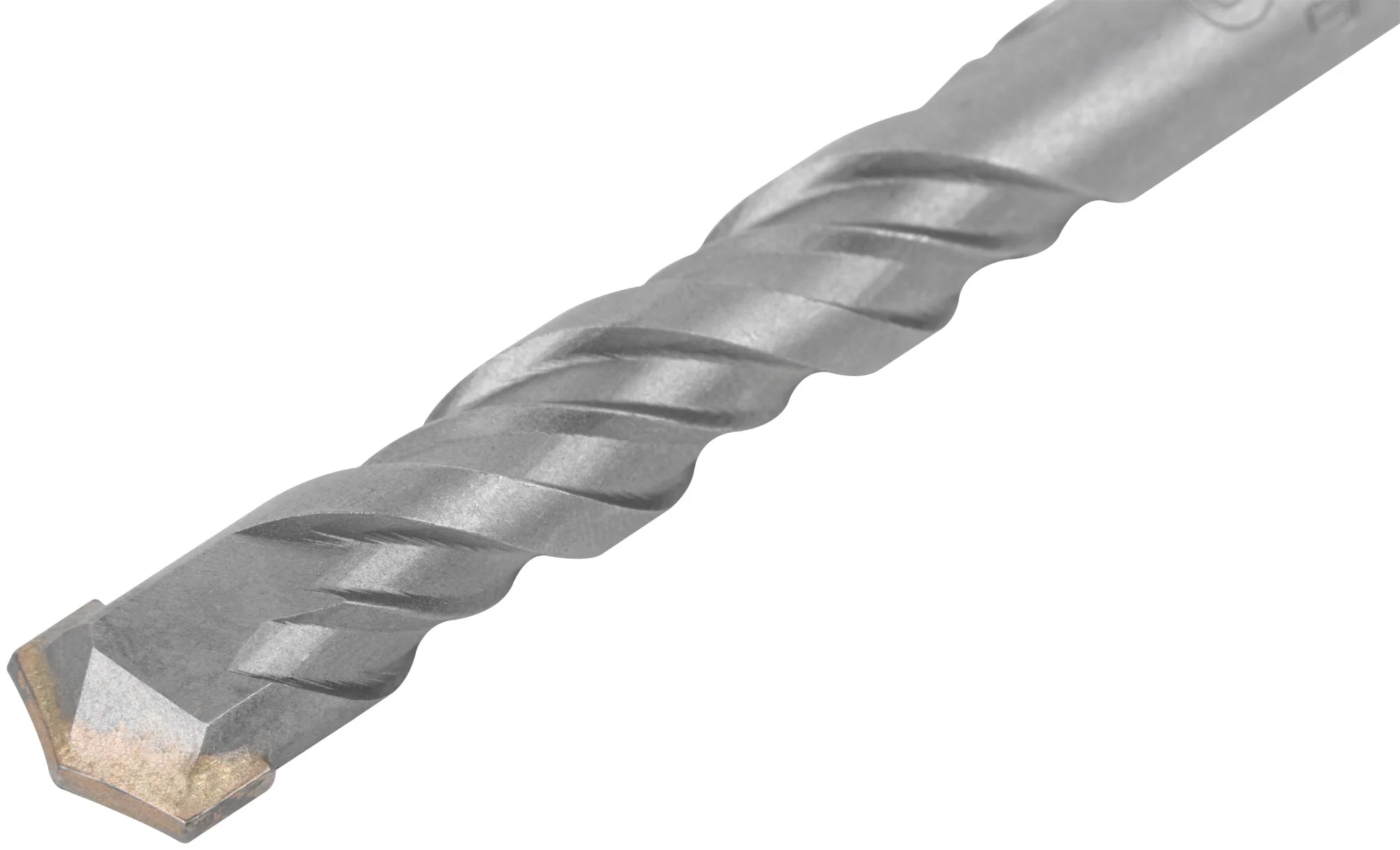 Бур оснащен хвостовиком SDS-PLUS, что обеспечивает легкую и быструю установку в перфоратор. W-образная вставка с добавлением 8% кобальта улучшает позиционирование на поверхности, а двойная спираль способствует быстрому отводу материала и эффективному охлаждению.