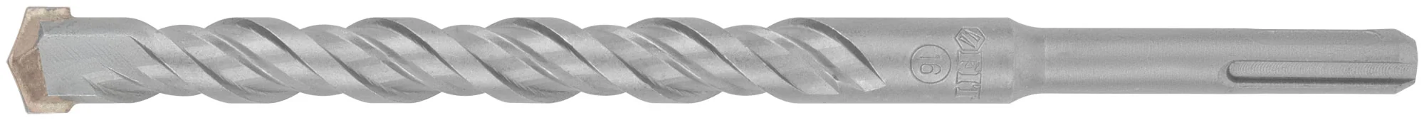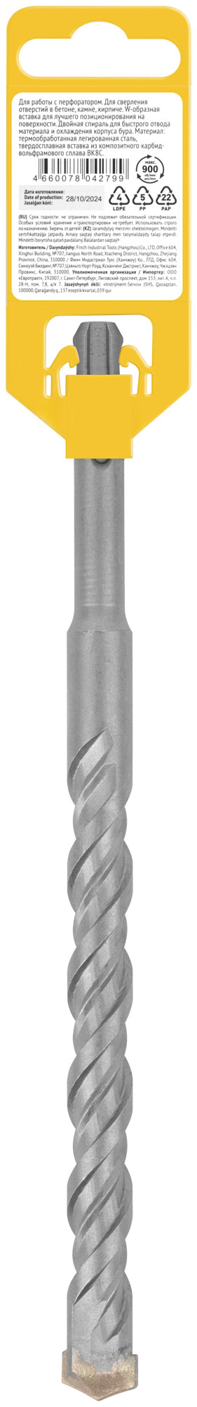 Бур оснащен SDS-PLUS хвостовиком, который обеспечивает легкую замену и надежную фиксацию в инструменте. W-образная вставка с добавлением 8% кобальта улучшает позиционирование бура на поверхности, а двойная спираль способствует быстрому отводу материала и охлаждению корпуса.