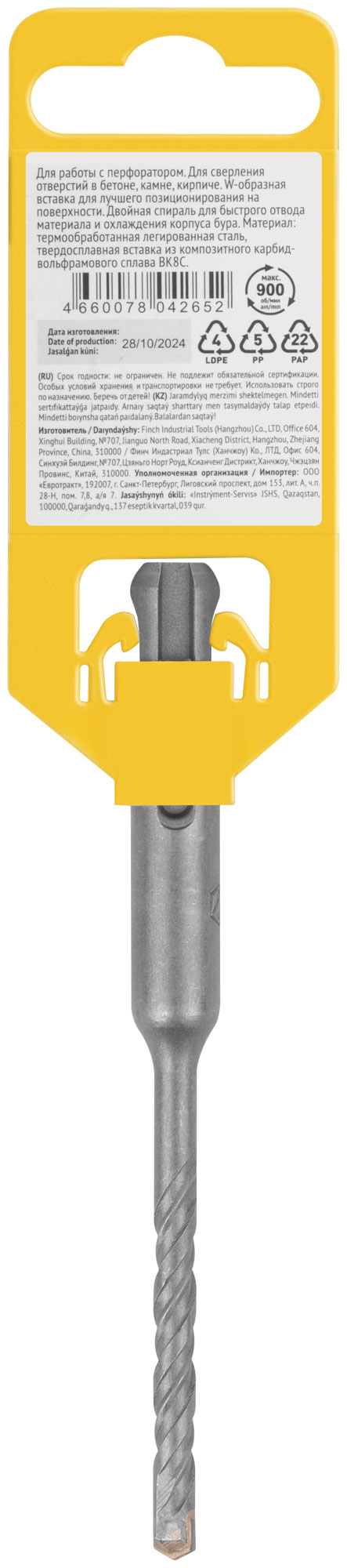 Бур оснащен W-образной вставкой с 8% содержанием кобальта, что обеспечивает точное позиционирование и долговечность. Двойная спираль позволяет быстро отводить материал, способствуя эффективному охлаждению корпуса бура и предотвращая перегрев.