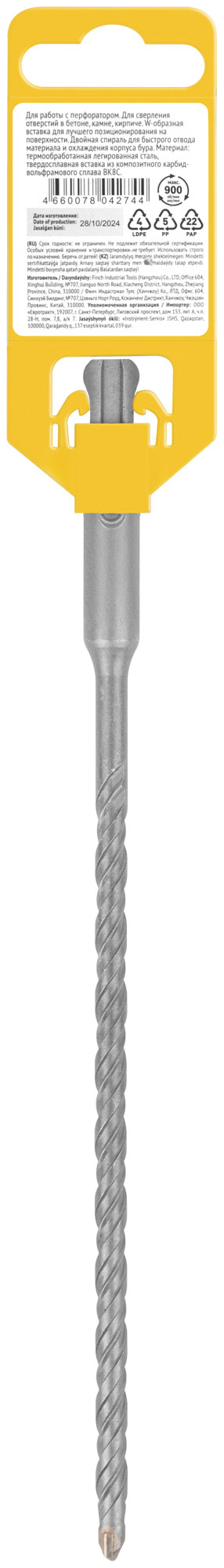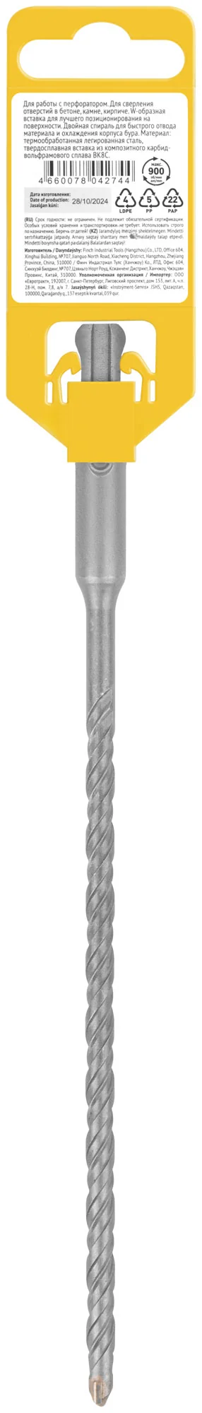 Бур оснащен W-образной вставкой с добавлением 8% кобальта, что обеспечивает лучшее позиционирование на поверхности и увеличивает срок службы инструмента. Двойная спираль способствует быстрому отводу материала и эффективному охлаждению, что особенно важно при длительном использовании.