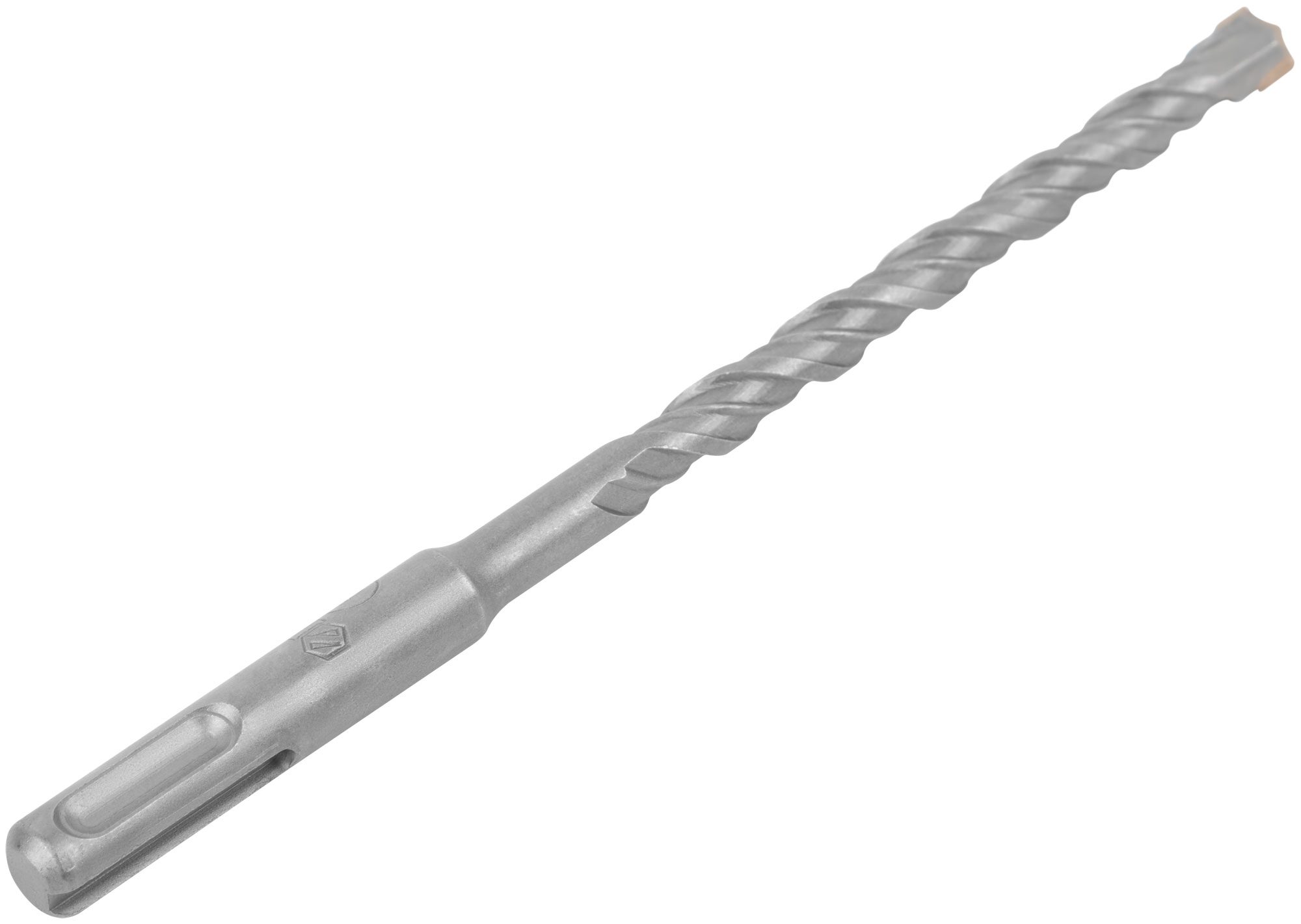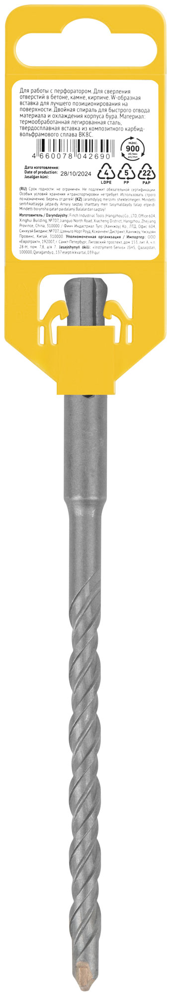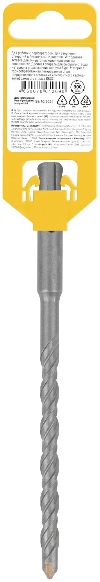 Бур оснащён SDS-PLUS хвостовиком, что обеспечивает надёжное крепление в перфораторе. W-образная вставка с добавлением 8% кобальта помогает в точном позиционировании на поверхности, а двойная спираль гарантирует эффективный отвод материала и охлаждение корпуса.