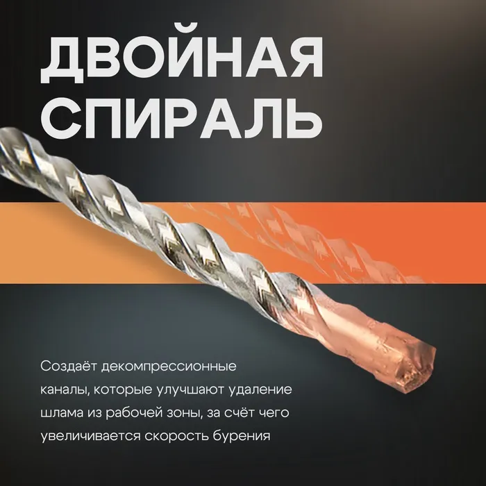 Двойная спираль послужит для улучшенного пылеотведения от продуктов бурения, выводя весь шлак из отверстия, благодаря чему снижается риск перегрева, заклинивания инструмента и ускоряется установка крепежа.