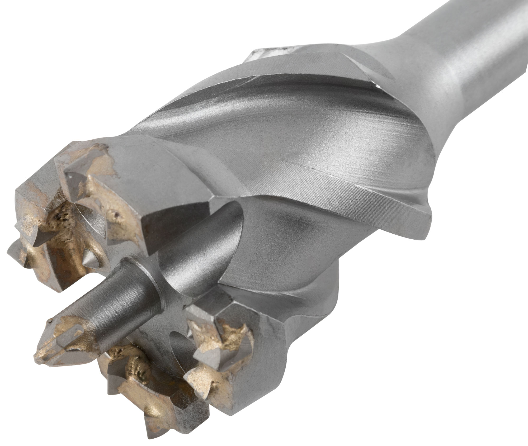 Бур оснащен хвостовиком SDS-MAX и изготовлен из термообработанной легированной инструментальной стали 40 Cr. Твердосплавные резцы из карбида вольфрама ВК8С обеспечивают высокую износостойкость, а тройная спираль улучшает отвод пыли и крошки.