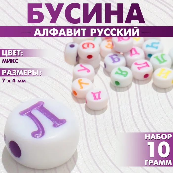 Бусина из акрила «Алфавит русский» МИКС — это набор бусин с изображением русских букв. Размер каждой бусины составляет 7×4 мм, а в упаковке — 10 граммов, что обеспечивает достаточное количество материалов для различных творческих проектов.