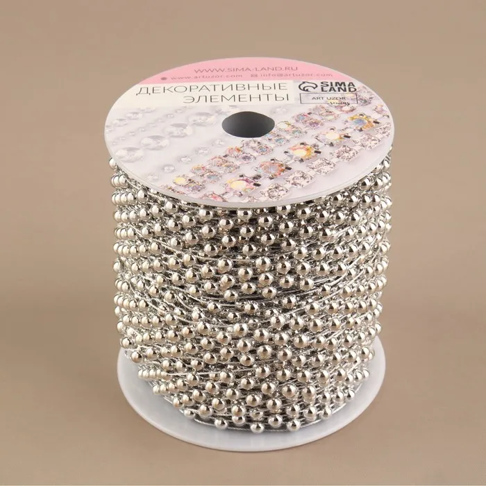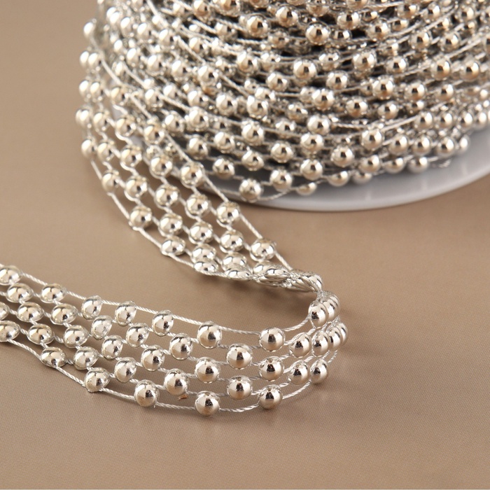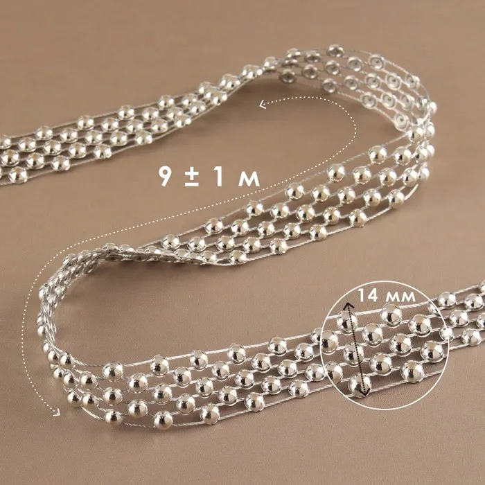 Серебристые плоские бусины на прочной нити — универсальный декор для праздничного оформления и рукоделия. Гибкая лента длиной около 9 метров с пластиковыми элементами (14 мм) создает эффект металлического кружева. Подходит для быстрого преображения интерьера, создания украшений и декоративной отделки.