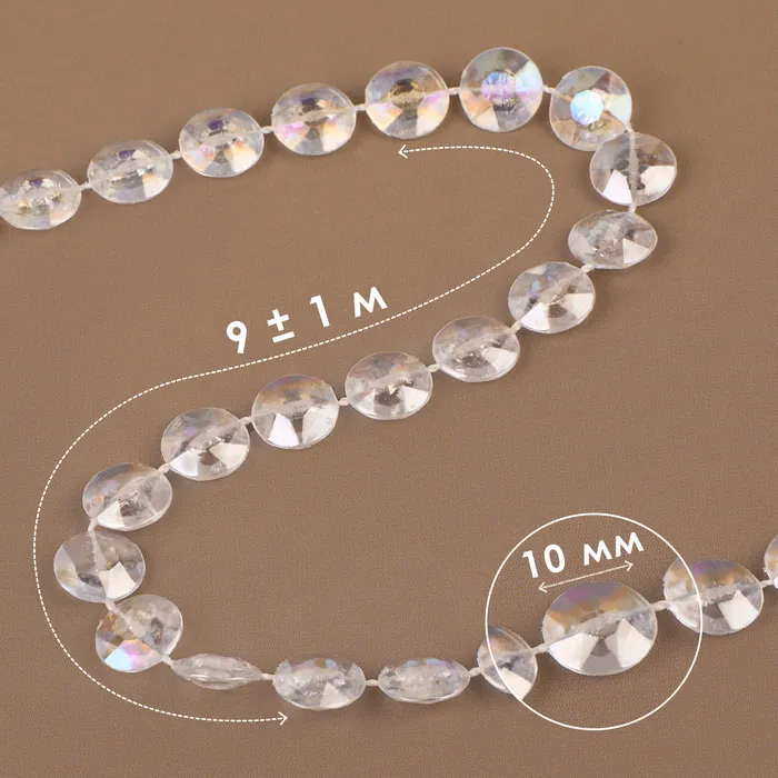 Прозрачные голографические бусины — волшебное преображение для любого декора. Крупные 10-миллиметровые сферы на прочной нити длиной 9 метров создают эффект переливающихся капель воды. Голографическое покрытие играет всеми цветами радуги при движении или изменении освещения.