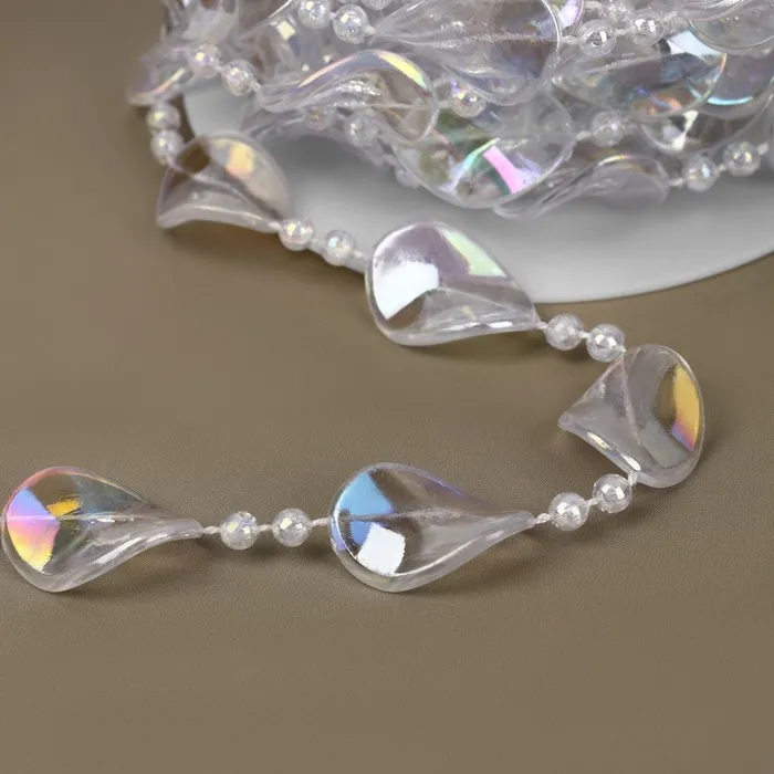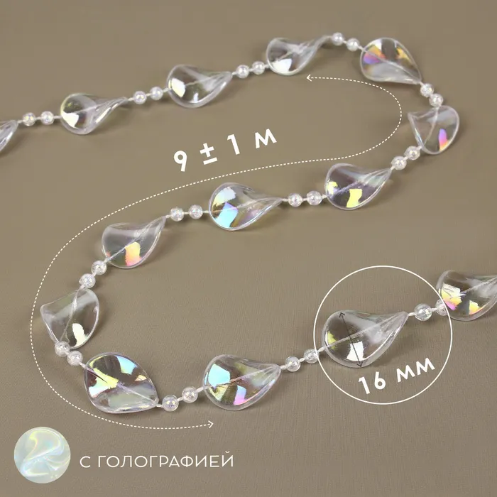 Прозрачные бусины с голографическим эффектом — это лёгкий и многофункциональный элемент декора для творчества и оформления. Диаметр каждой бусины — 16 мм, что делает их заметным, но универсальным акцентом. Нить длиной от 8 до 10 метров подходит как для масштабных проектов, так и для точечного украшения одежды, подарков, интерьерных деталей и новогодних композиций.