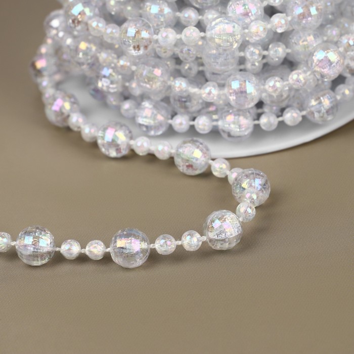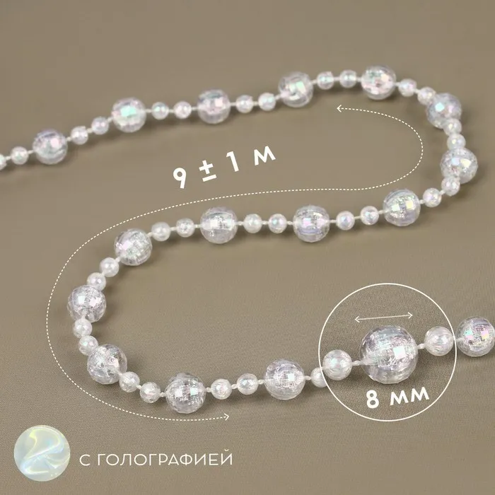 Каждая нить длиной 9±1 метр предлагает безграничные возможности для творчества. Голографический эффект придаёт бусинам особую глубину и блеск, благодаря чему они органично впишутся как в новогодние декорации, так и в оформление свадеб, фотосессий или интерьерных композиций. Прозрачный цвет позволяет экспериментировать с освещением, создавая потрясающие визуальные эффекты.