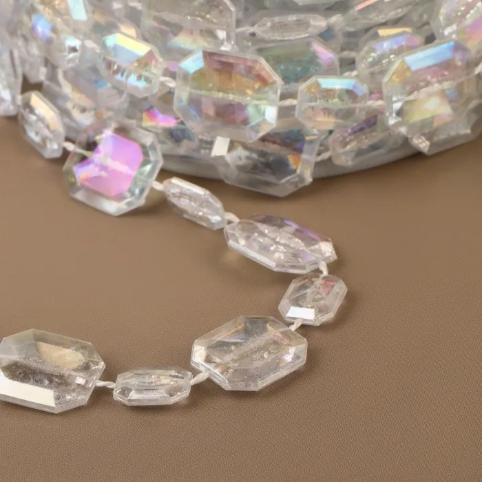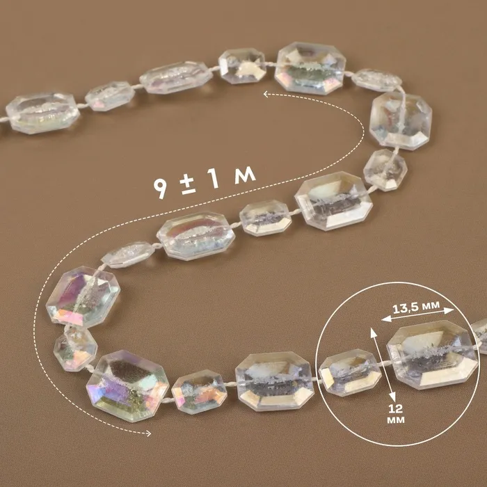 Голографические прозрачные бусины создают эффект переливающихся кристаллов в интерьере. Нити длиной 9 метров с 11-миллиметровыми сферами преломляют свет, образуя радужные блики на поверхностях. Универсальный вариант для праздничного декора и дизайнерских проектов.
