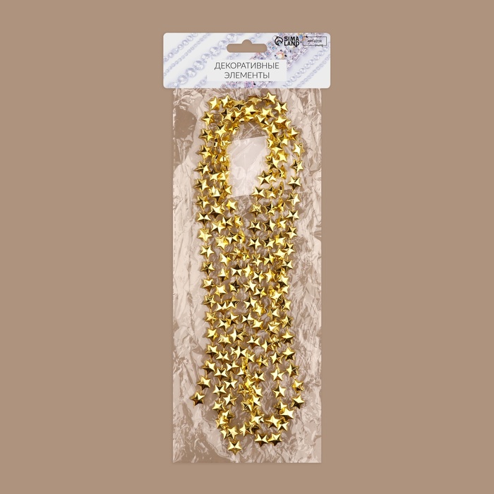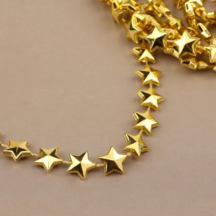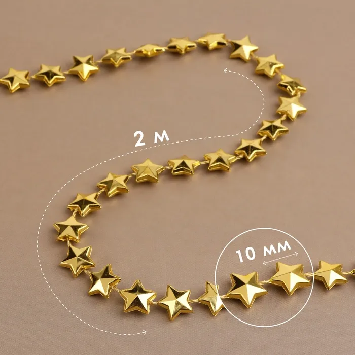 Бусины «Звёзды» — это лаконичный и яркий элемент декора для разных случаев. Золотистый цвет и форма звёздочек добавляют изделиям свет и настроение праздника. Бусины диаметром 10 мм нанизаны на прочную нить длиной 2 метра, что делает их удобными для оформления интерьеров, подарков и аксессуаров.
