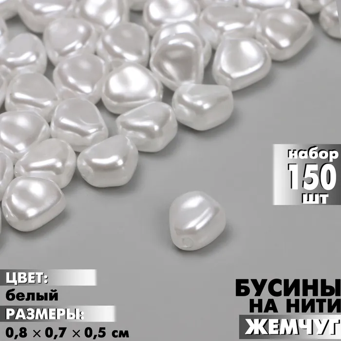Бусины пластиковые на нити «Жемчуг», 0.8×0.7×0.5 см, набор 150 шт, цвет белый — Характеристики