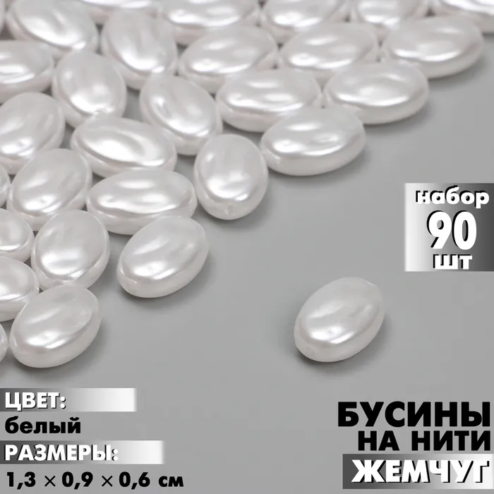 Бусины пластиковые на нити «Жемчуг», 1.3×0.9×0.6 см, набор 90 шт, цвет белый — Характеристики