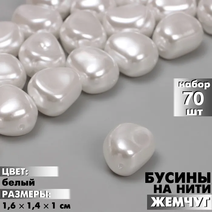 Бусины пластиковые на нити «Жемчуг», 1.6×1.4×1 см, набор 70 шт., белые — Характеристики