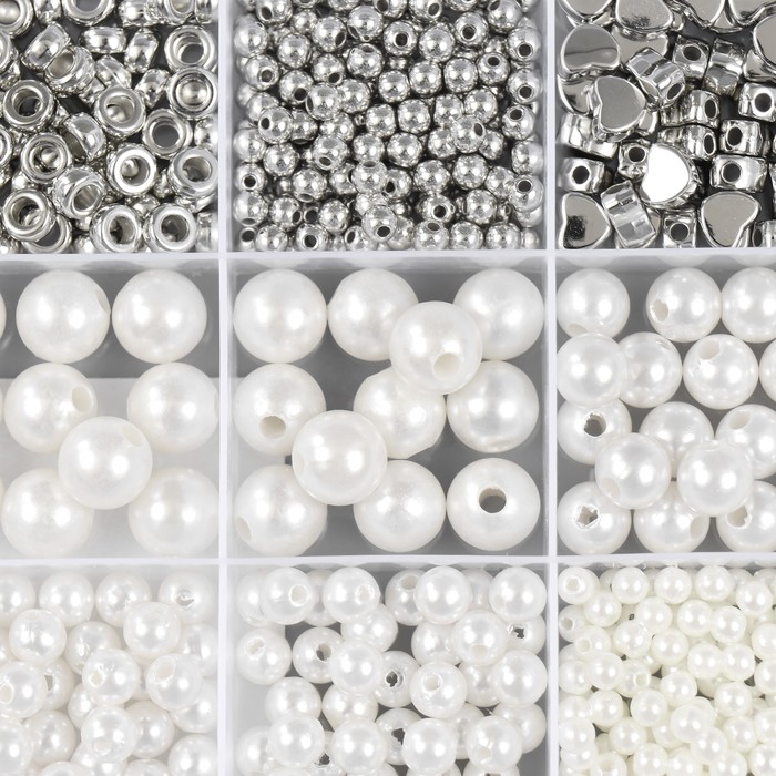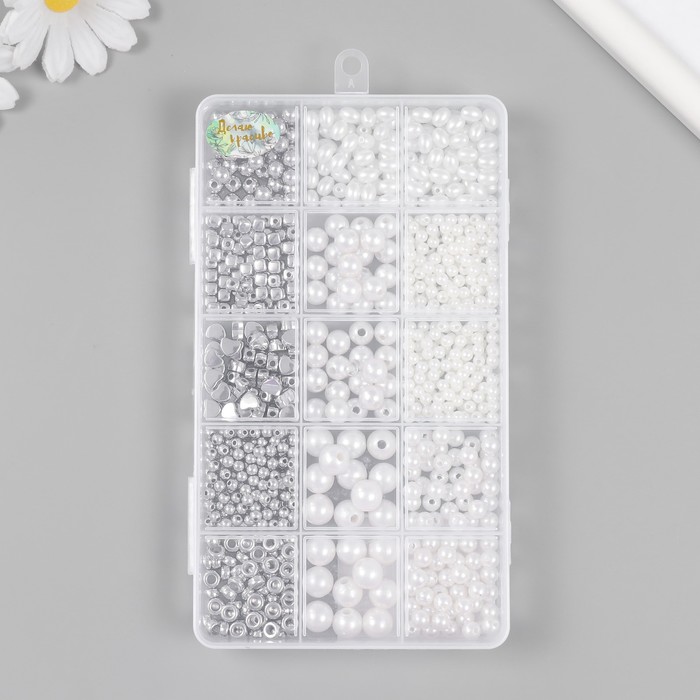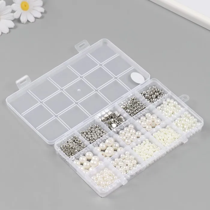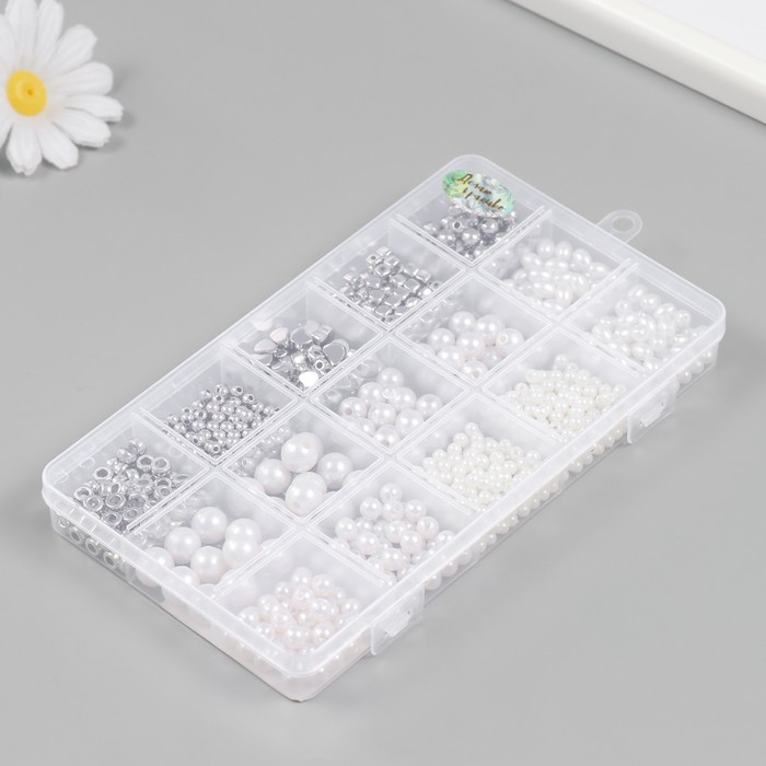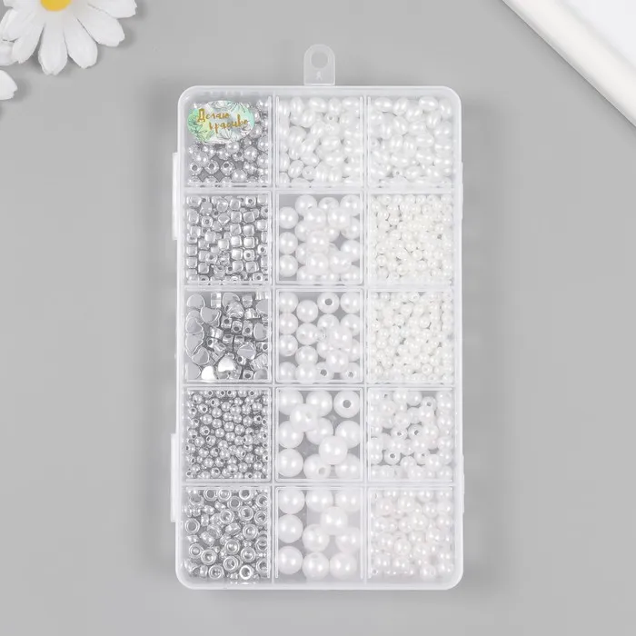 Бусины в шкатулке «Белый перламутр и серебро», 15 делений, 10×17.5×2 см — Характеристики