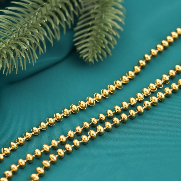 Золотистые бусы длиной 2 метра с диаметром 4 мм создают изящное украшение для новогодней ёлки. Их однотонный оттенок подчёркивает стиль ар-деко и новогоднего барокко, добавляя торжественную атмосферу и утончённость праздничному декору.