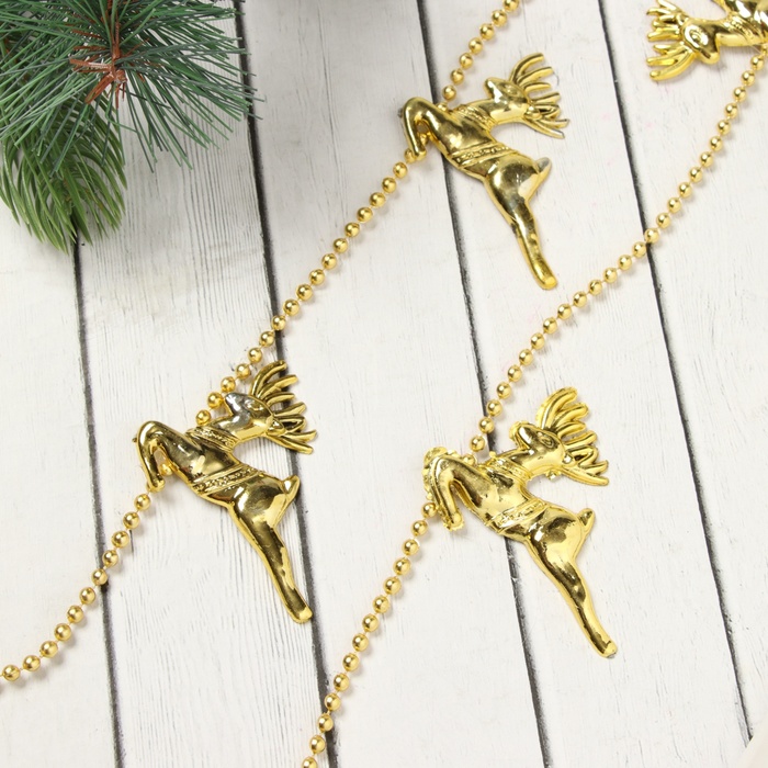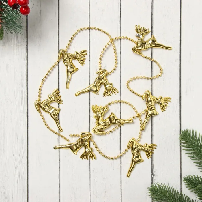 Золотистые бусики в виде оленей длиной 1 метр станут стильным украшением для новогодней елки и праздничного интерьера. Их резная поверхность придает изделию особую изысканность, а классическая форма создает уютную атмосферу зимних праздников.