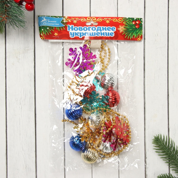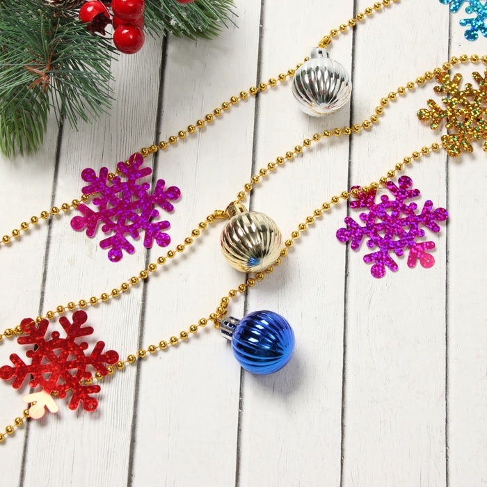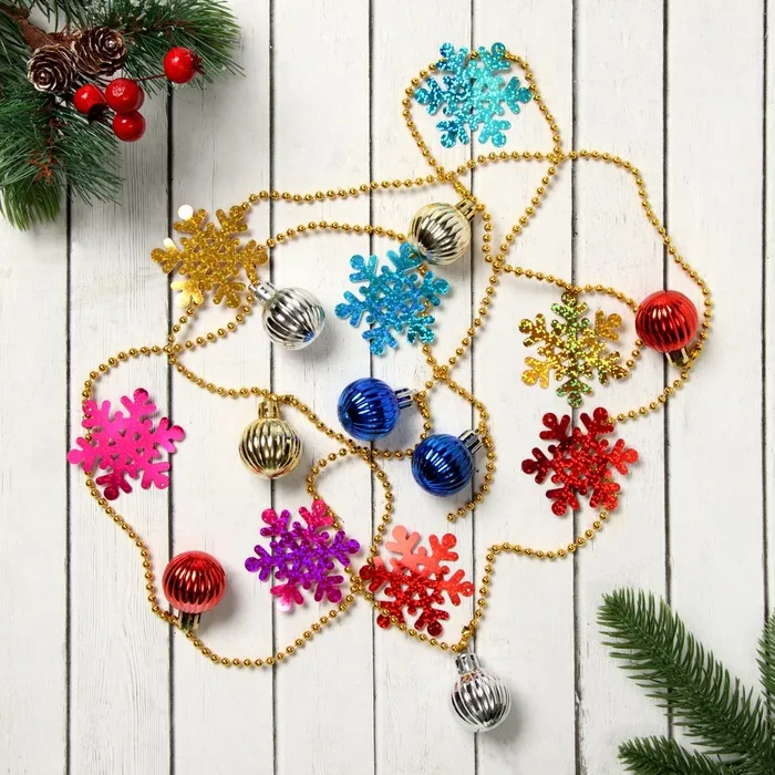 Добавьте ярких красок и зимнего очарования в новогодний декор! Разноцветные бусы «Снежинки и шарики» длиной 2 метра станут идеальным выбором для тех, кто ценит праздничное настроение и стильный дизайн. Их резной узор и игривая цветовая палитра наполнят интерьер радостью и теплом.