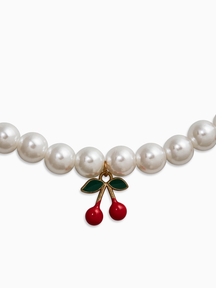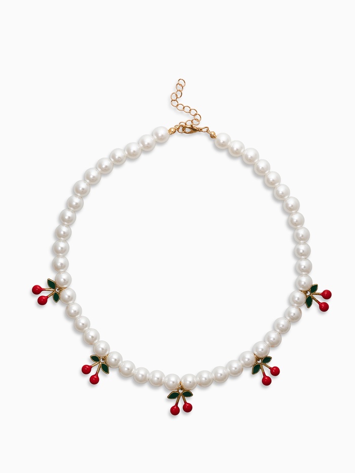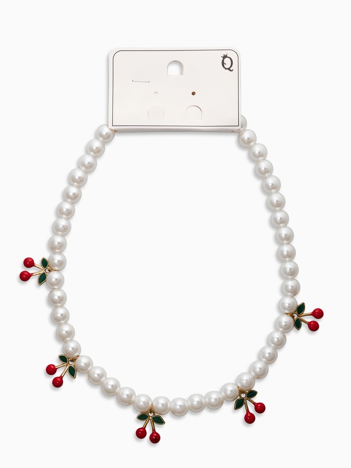 - Богатая композиция: сочетание белого жемчуга и алых декоративных деталей в форме вишни дарит особую глубину восприятия и привлекает внимание к линии шеи.