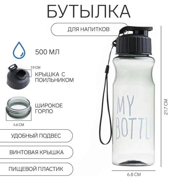 Бутылка объемом 500 мл (0.5 литра) предназначена для употребления воды, соков и других напитков. Отличный аксессуар для активного отдыха. Оригинальная форма, с захватом для пальцев, а также специальный ремешок обеспечивает удобство во время прогулок, тренировок и в спортивном зале. Изготовлена из безопасного, пищевого пластика, не содержит бисфенола-А. Продуманный дизайн для максимального комфорта: бутылка имеет герметичную крышку, что обеспечивает надежную защиту от проливания.