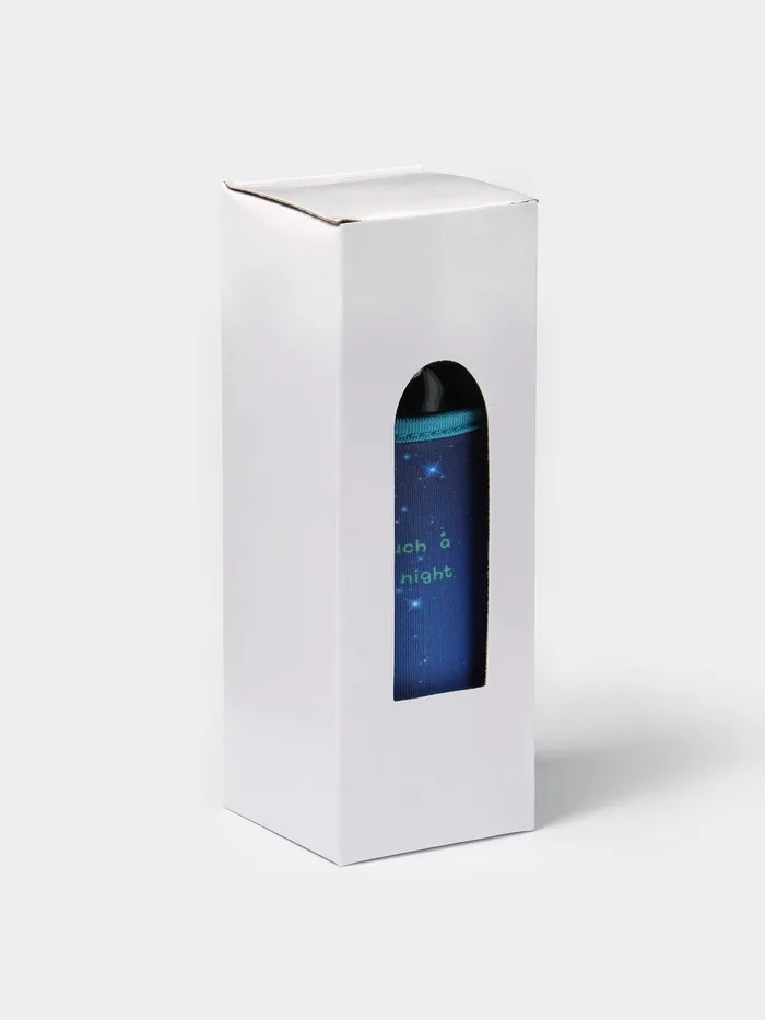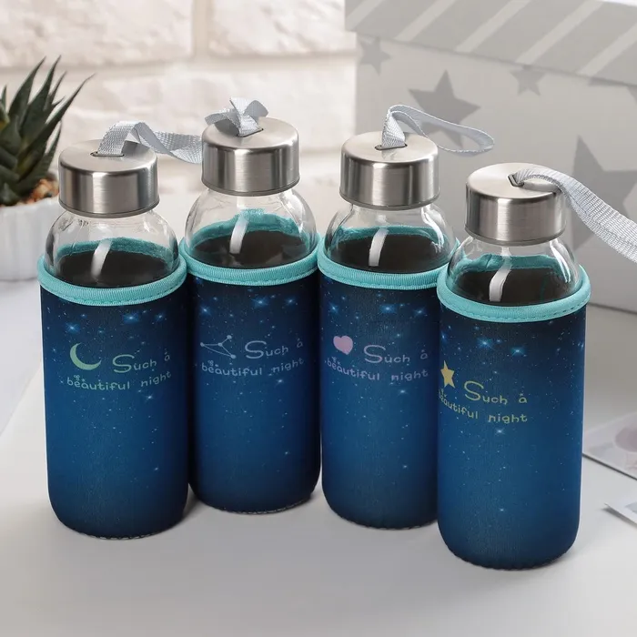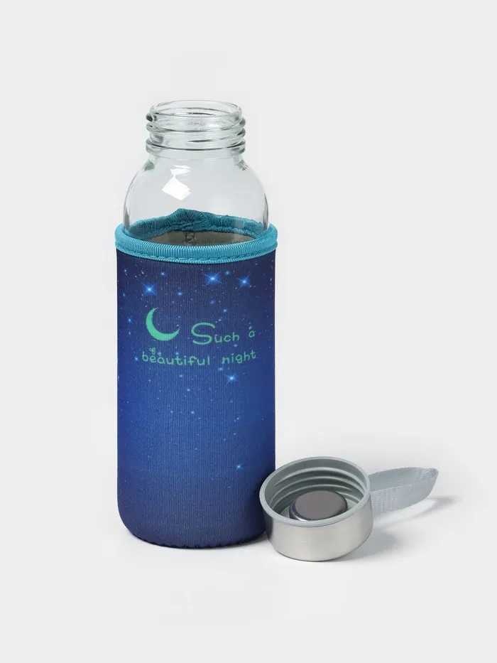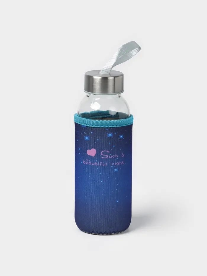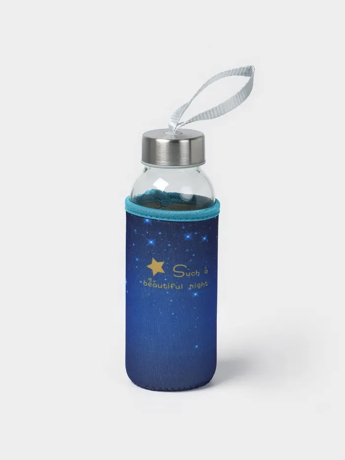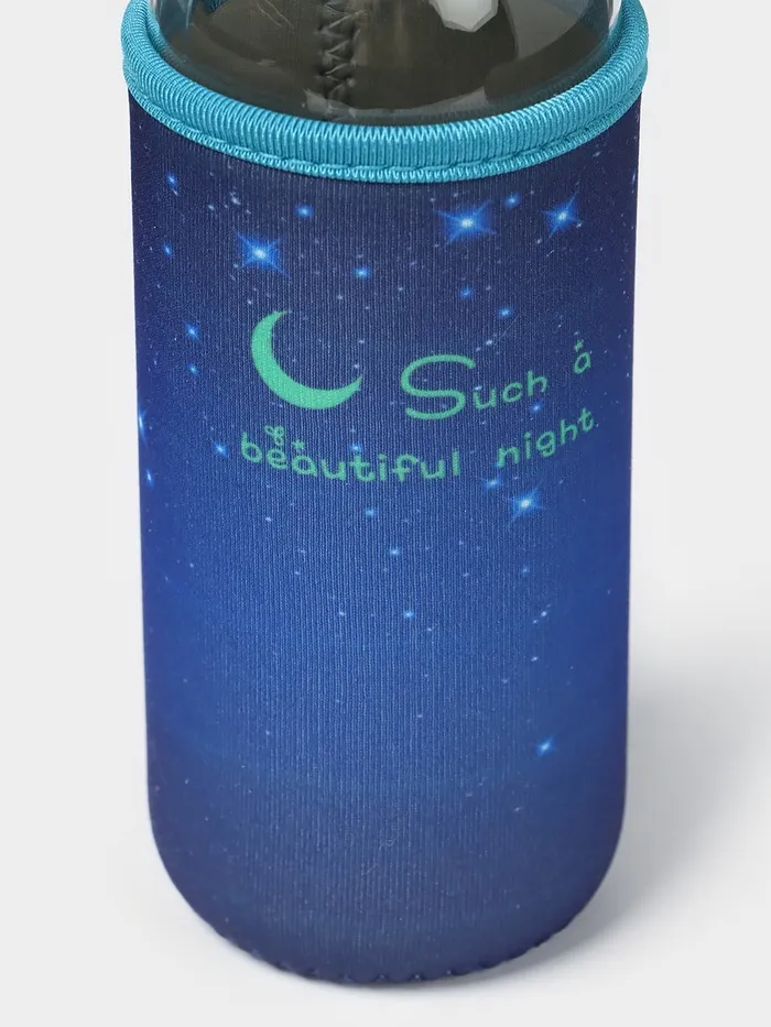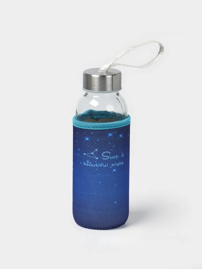 Стеклянная бутылка объёмом 300 мл с небесным рисунком на чехле станет компактным и стильным аксессуаром для ежедневного использования.
