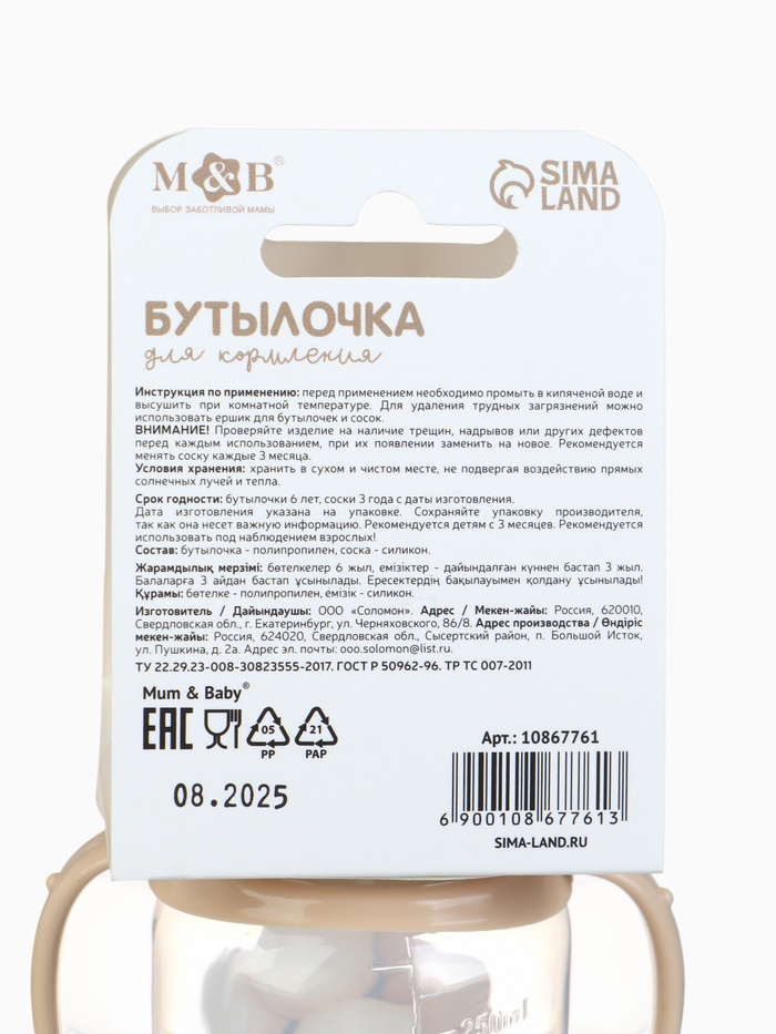 Бутылочка для кормления Baby Bear 250 мл, цилиндр, бежевый Mum&Baby — Характеристики