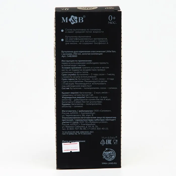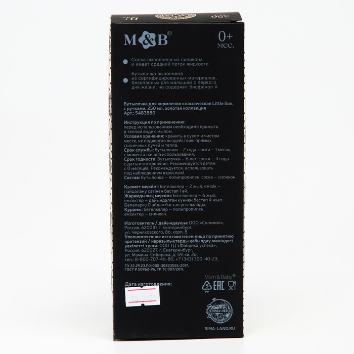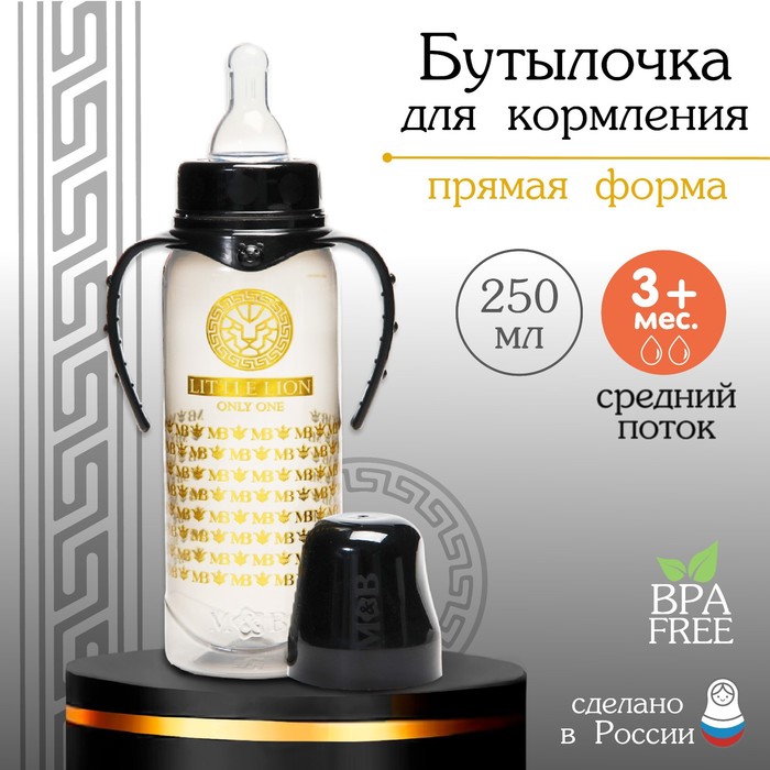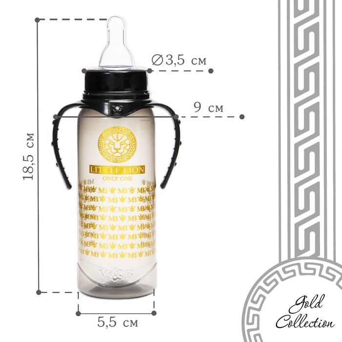 Бутылочка для кормления «Little lion», классическое горло, с ручками, 250 мл., от 0 мес., Золотая коллекция — Характеристики