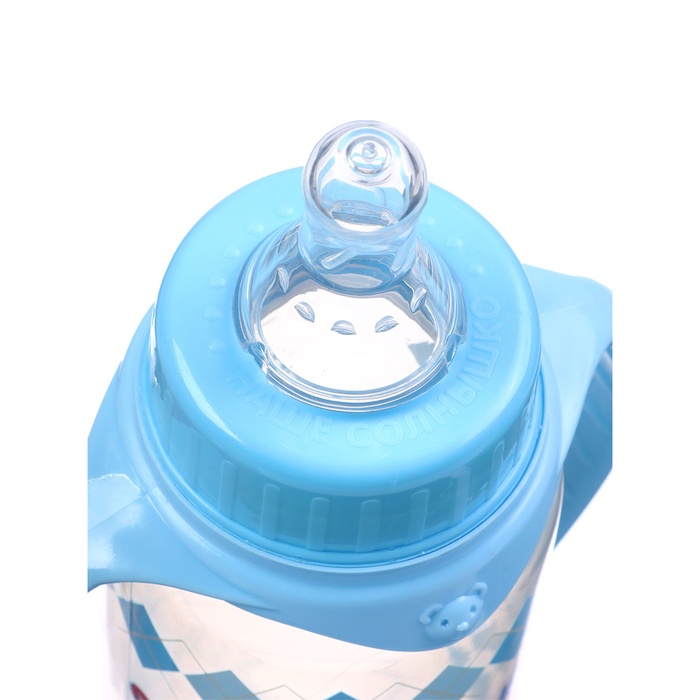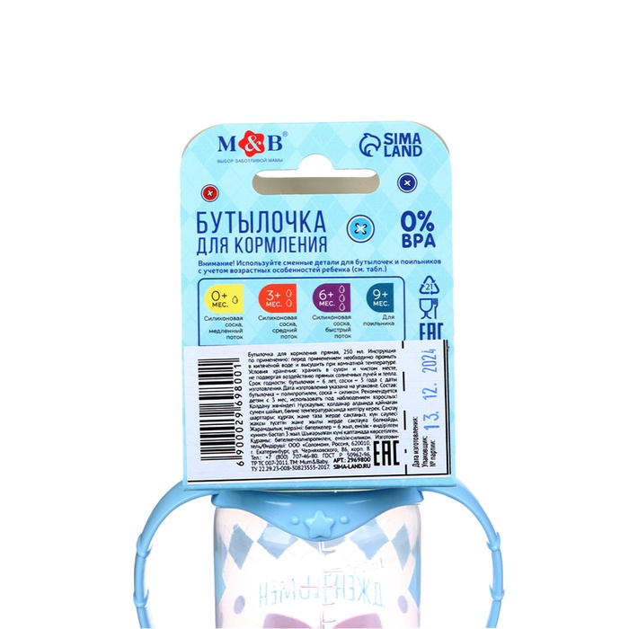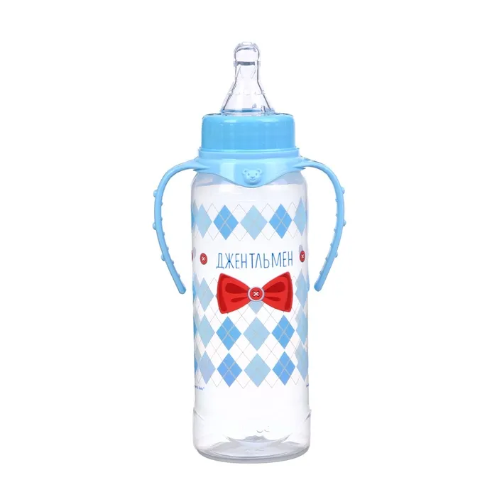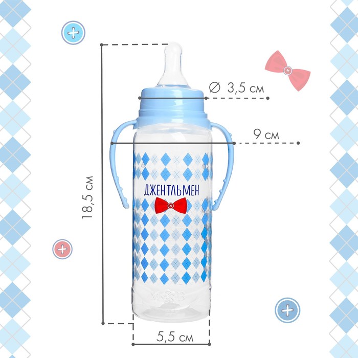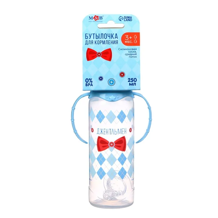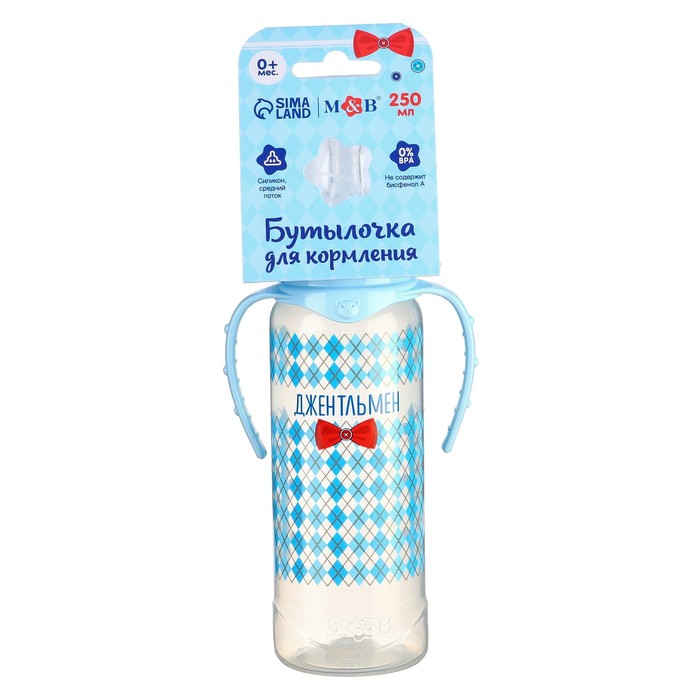 Бутылочка для кормления малыша M&B «Маленький джентльмен», классическое горло, с ручками, от 3 мес., 250 мл., голубой — Характеристики