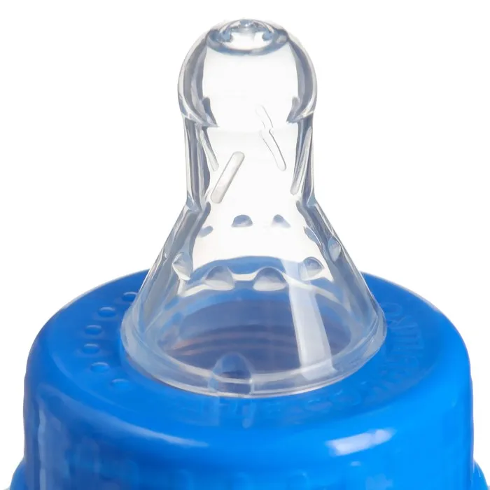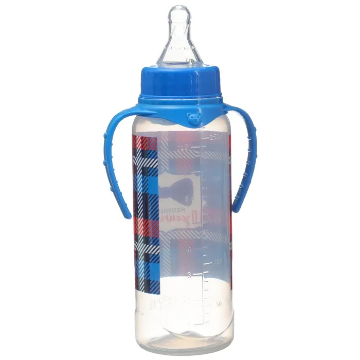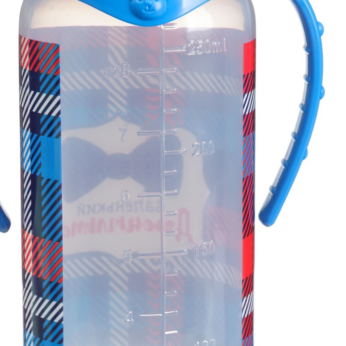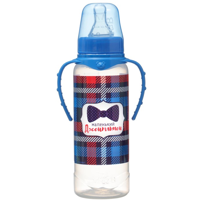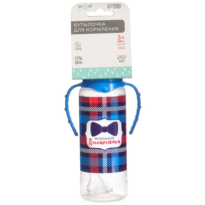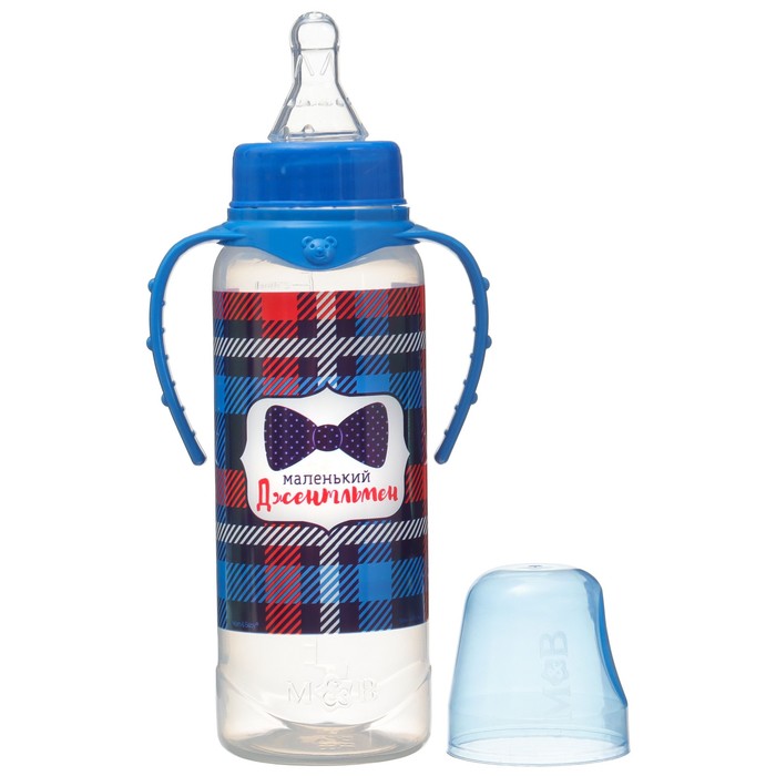 Бутылочка для кормления малыша M&B «Маленький джентльмен», классическое горло, с ручками, от 3 мес., 250 мл., синяя — Характеристики