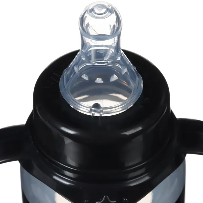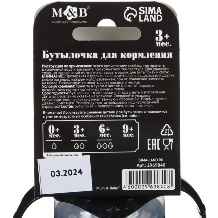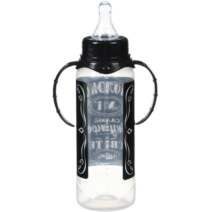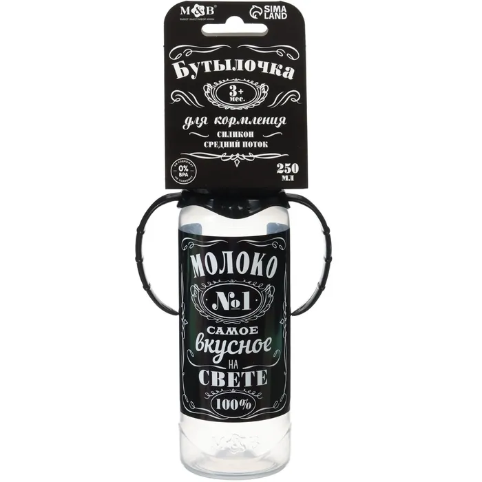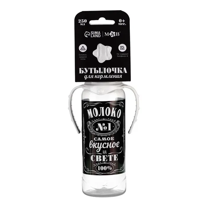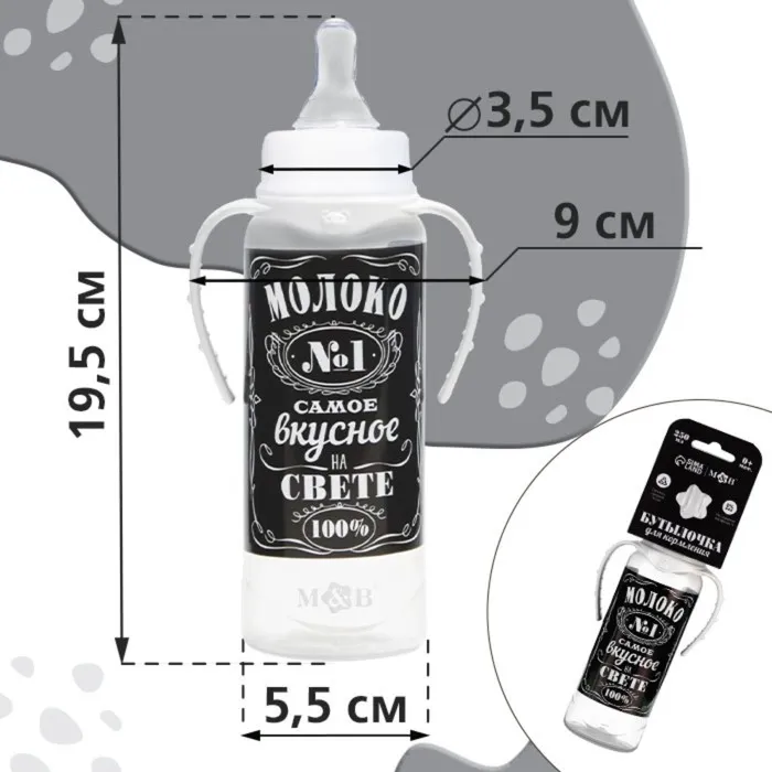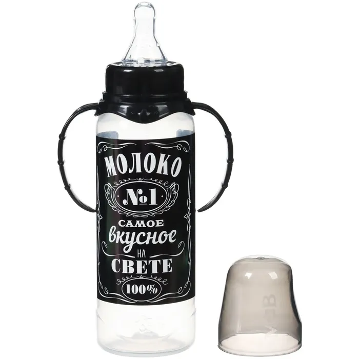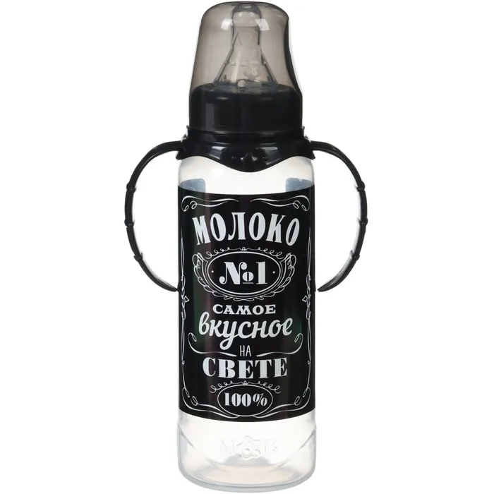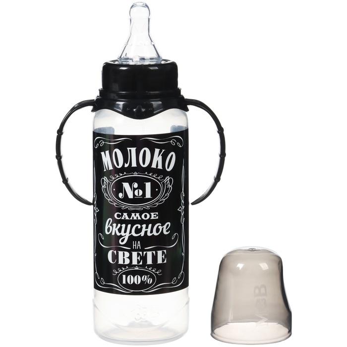 Бутылочка для кормления малыша M&B «Молоко № 1», классическое горло, с ручками, от 0 мес., 250 мл., чёрная — Характеристики