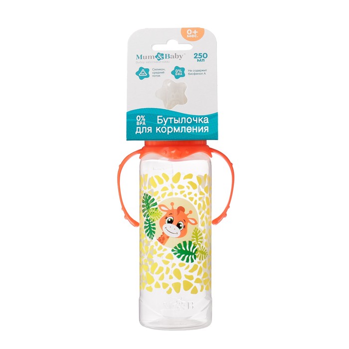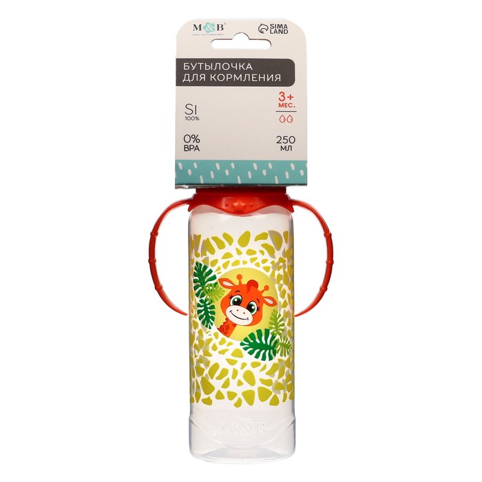 Бутылочка для кормления малыша M&B «Жирафик Лило», классическое горло, с ручками, от 0 мес., 250 мл., оранжевая — Характеристики