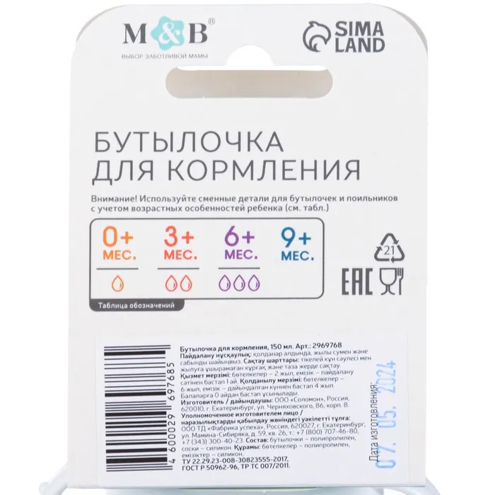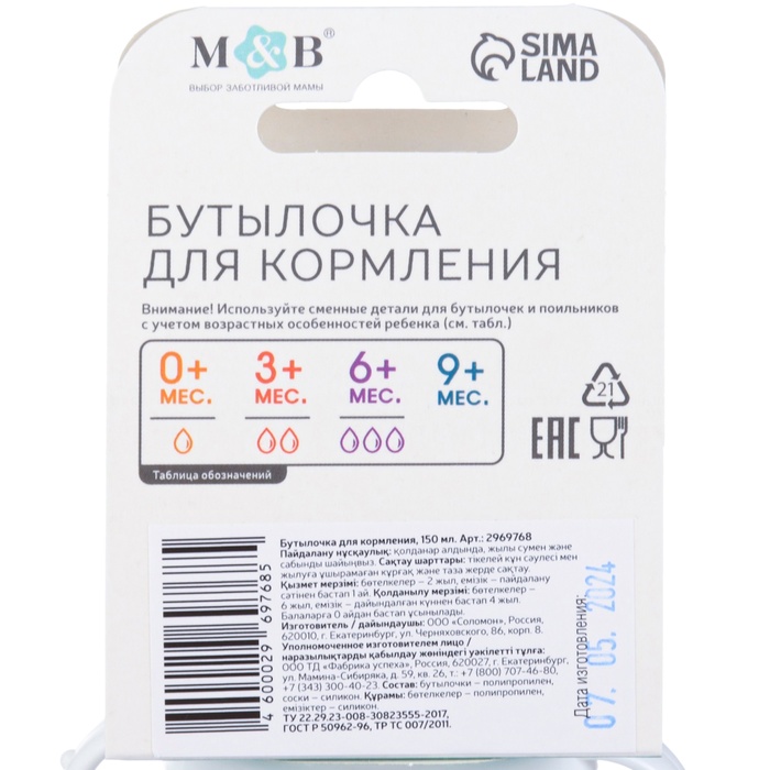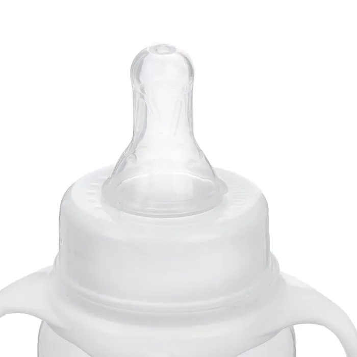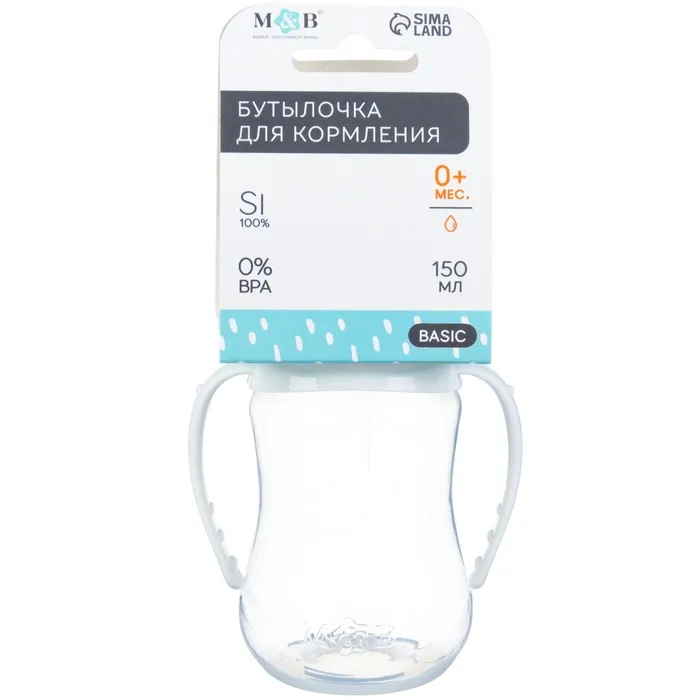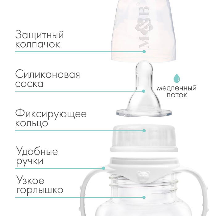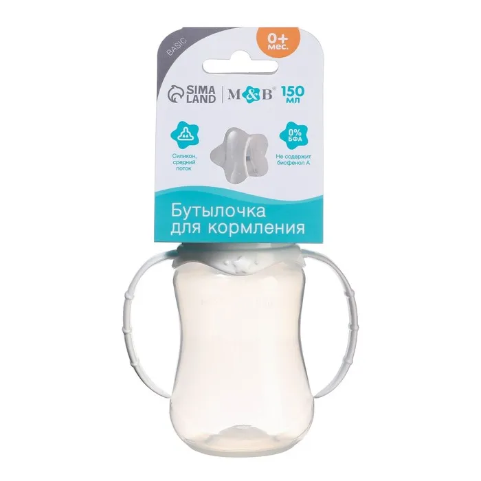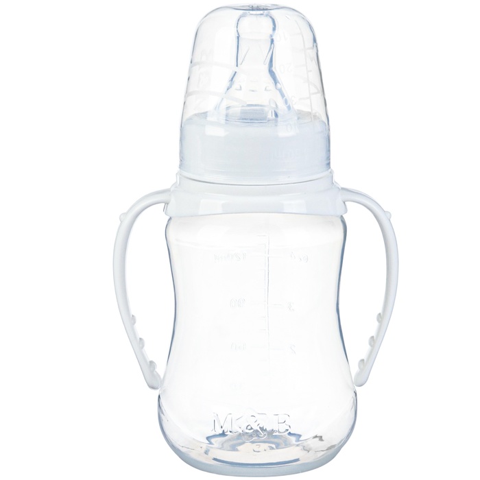 Бутылочка для кормления M&B, классическое горло, с ручками, от 0 мес., 150 мл., приталенная, белый — Характеристики