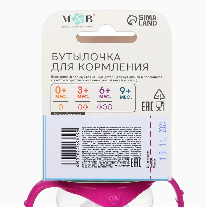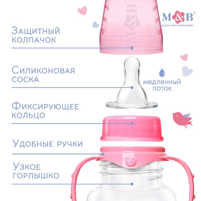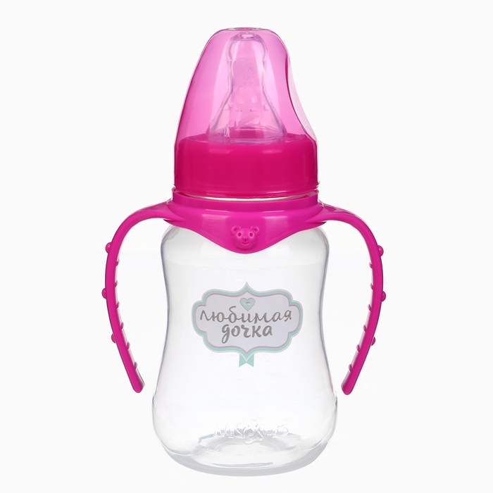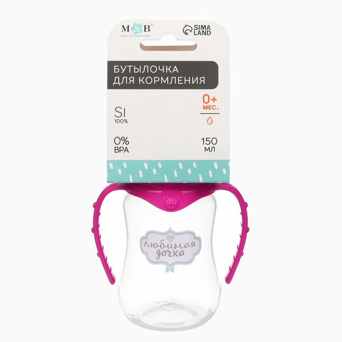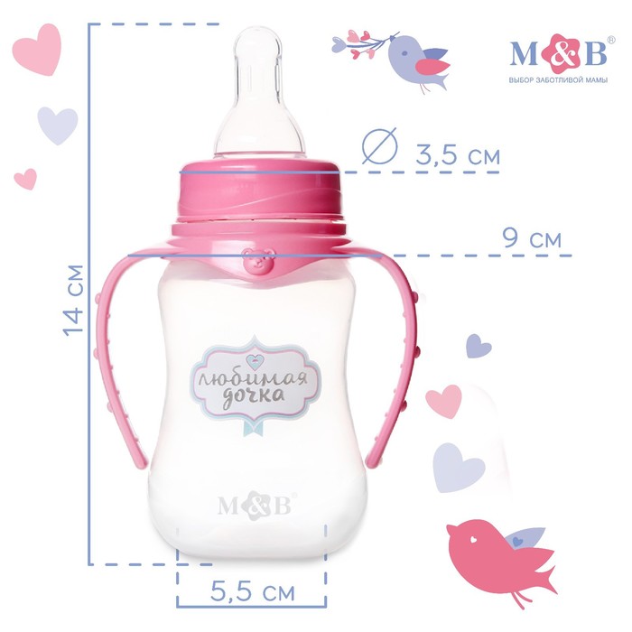 Бутылочка для кормления M&B «Любимая доченька», классическое горло, с ручками, от 0 мес., 150 мл., приталенная, розовый — Характеристики
