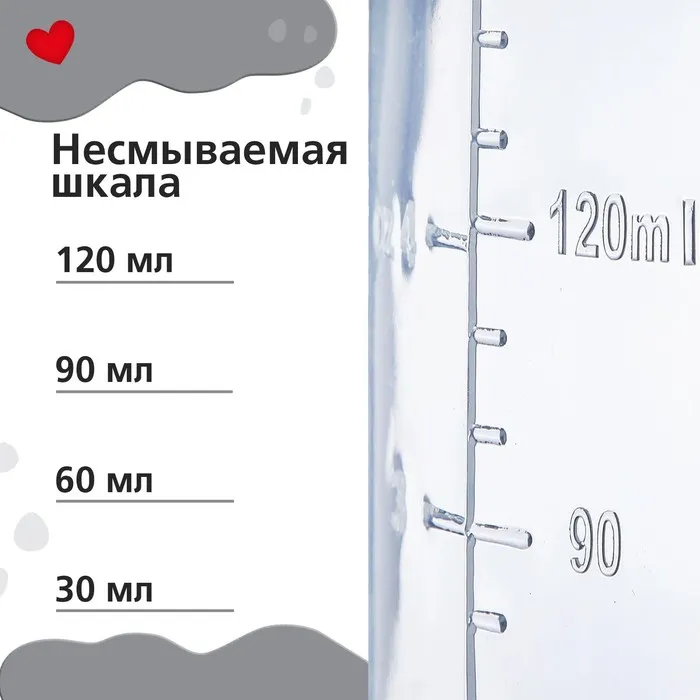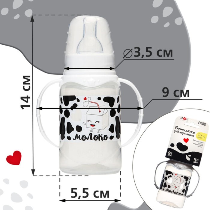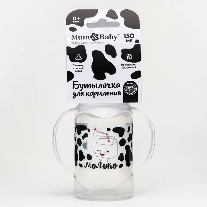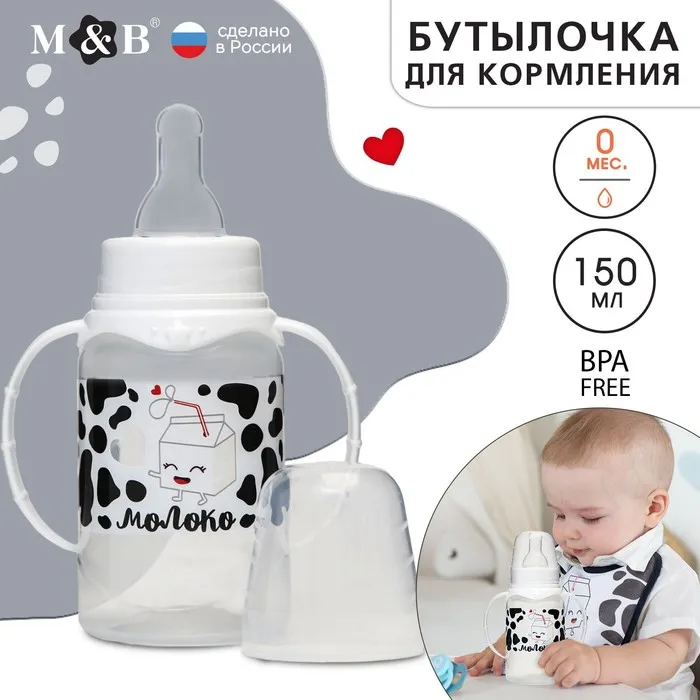 Бутылочка для кормления M&B «Люблю молоко», классическое горло, с ручками, от 0 мес., 150 мл., белый — Характеристики